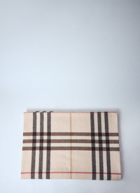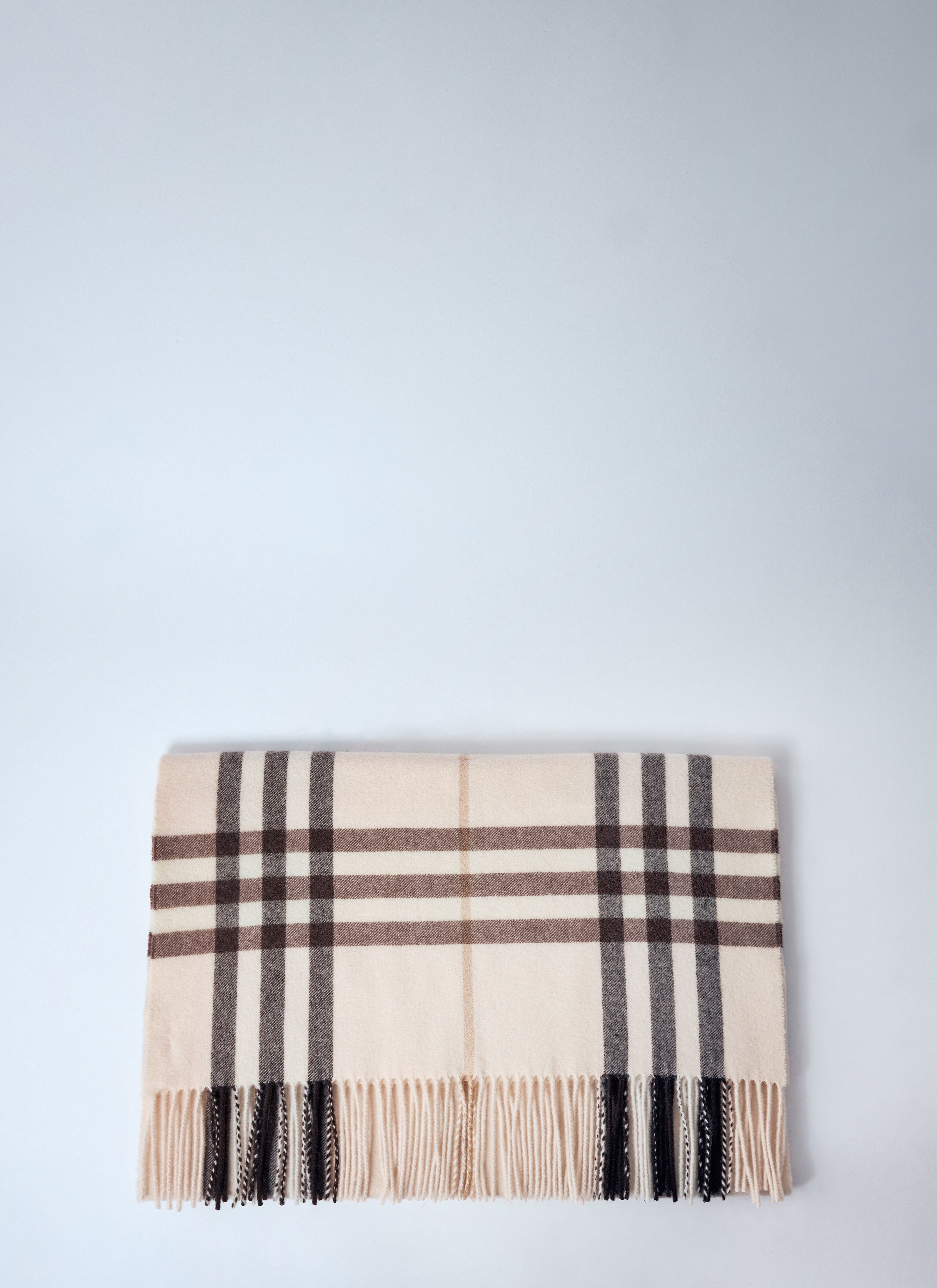 Cashmere scarf with iconic Burberry check. - Rectangle design - Fringe hem - Logo patch - Made in United Kingdom - 100% Cashmere - Color: Beige - Code: 8103021 A2888