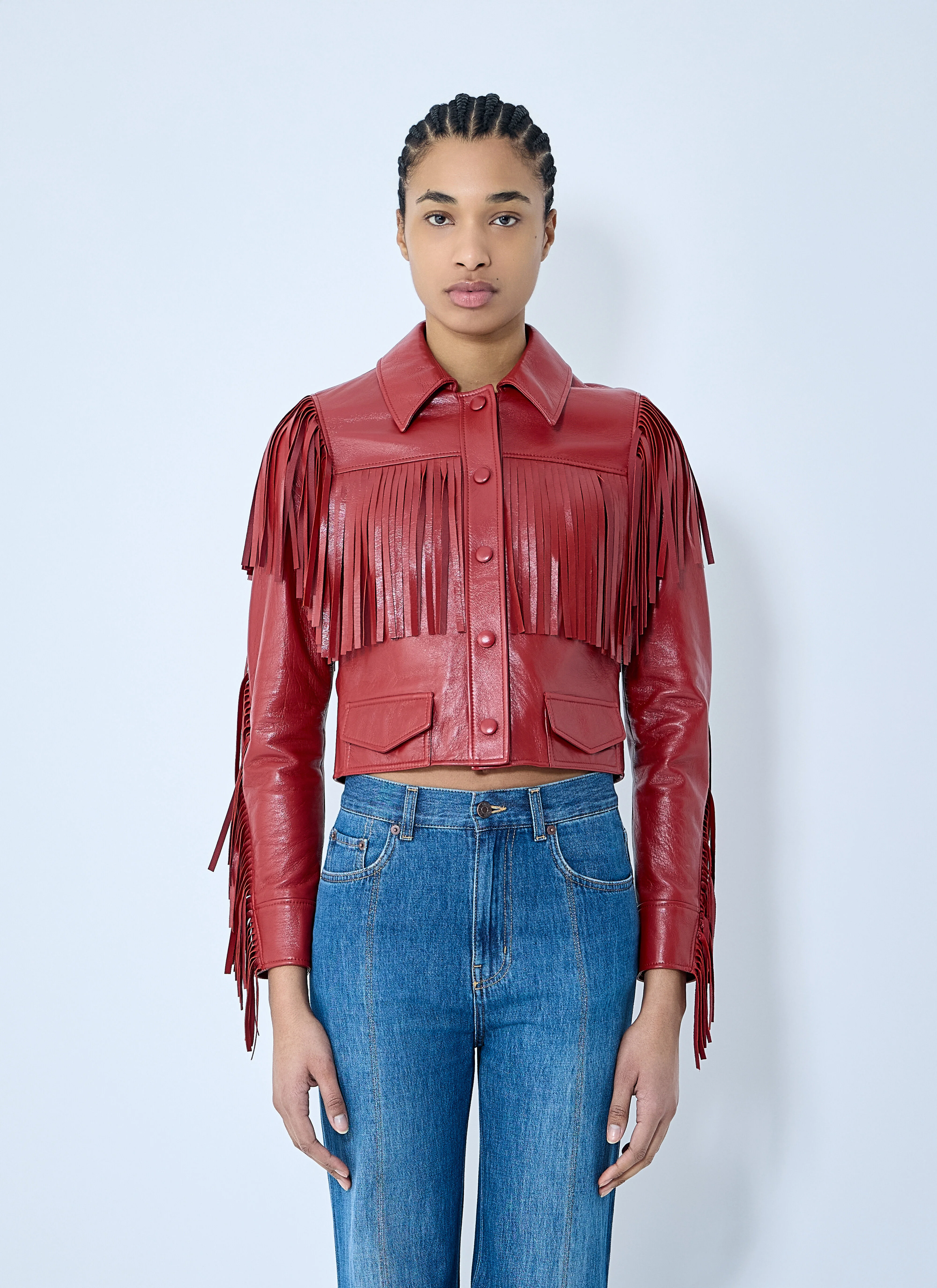 Leather jacket with all-over fringed embellishment. - Classic collar - Front button fastening - Long sleeves - Cropped construction - Fully lined - 100% Leather - Color: Red - Code: CH25SCV13206 640