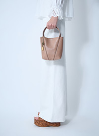 Leather in pebble-grain finish. - Twin handles - Magnetic fastening - Front logo print - Dangoing chain feature - 100% Leather - Color: Beige - Code: CH25SS812N84527