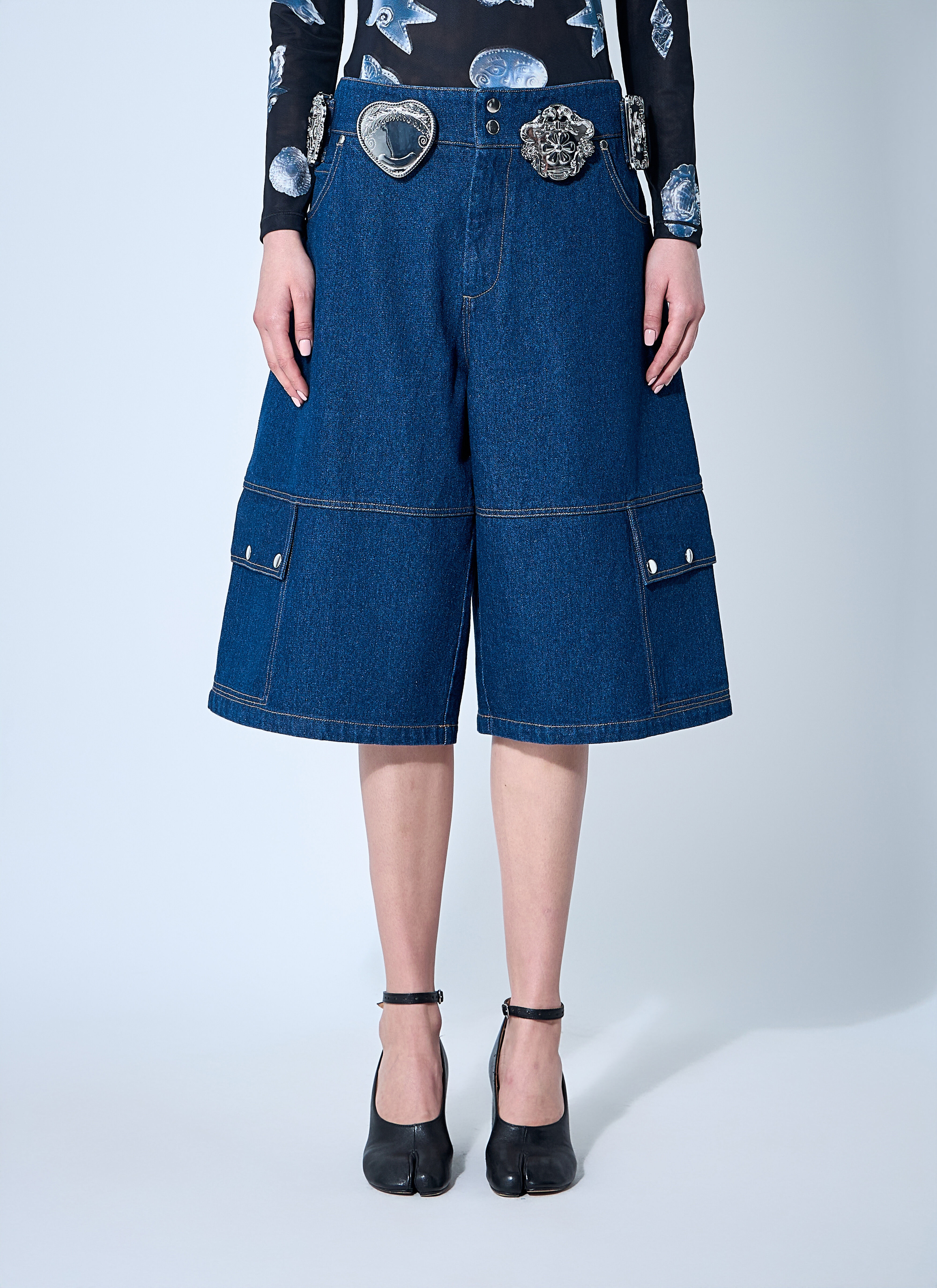 Denim shorts with non-detachable silver-tone hardware. - Mid rise - Top-button and zip-fly fastening - Belt loops - Multiple pockets - Pleated - 100% Cotton. Hand wash - Color: Blue - Code: 4098 - BALMY SHORTS -