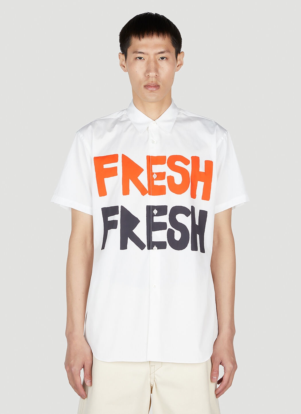 - Classic collar - Front button fastening - Short sleeves - Front text print - 100% Cotton. Machine wash cold - Color: White - Code: FK-B018-S23 1
