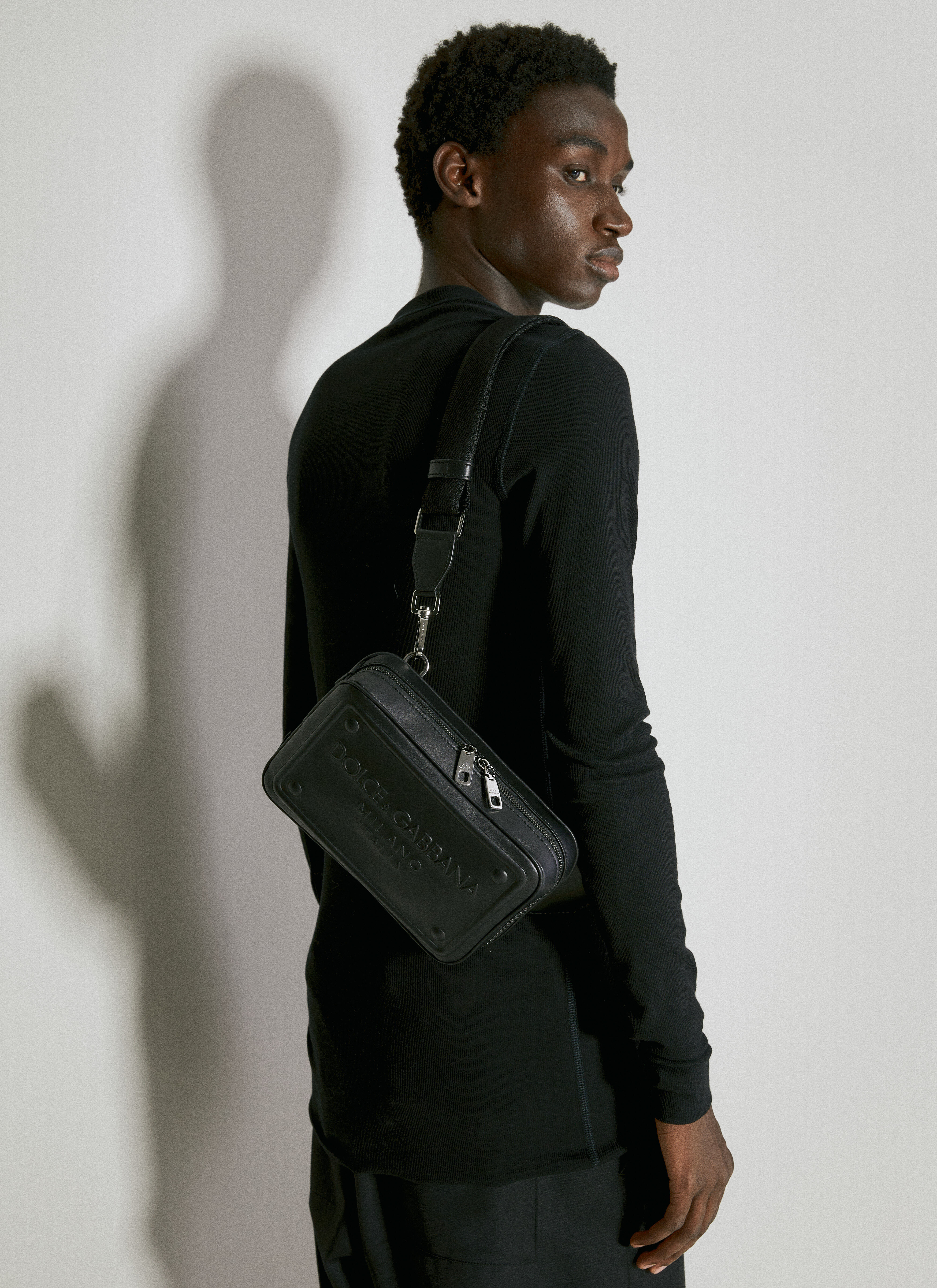 Leather crossbody bag with front embossed logo. - Adjustable crossbody strap - Zip around fastening - Front embossed logo - Rear zip pocket - One main compartment - Fully lined - Made in Italy - 90% Leather, 10% Viscose - Color: Black - Code: BM2264 AG218 80999