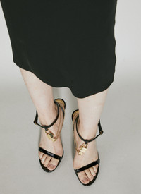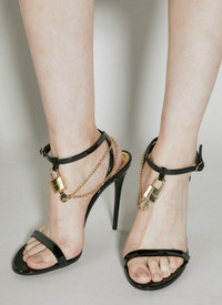 Patent leather heeled sandals with gold-tone padlock at front. - Open toe - Buckle fastening strap - Chains with padlock at front - Logo patch at footbed - Rear logo applique - Stiletto heel - Made in Italy - 100% Leather - Color: Black - Code: CR1615 A1471 89718