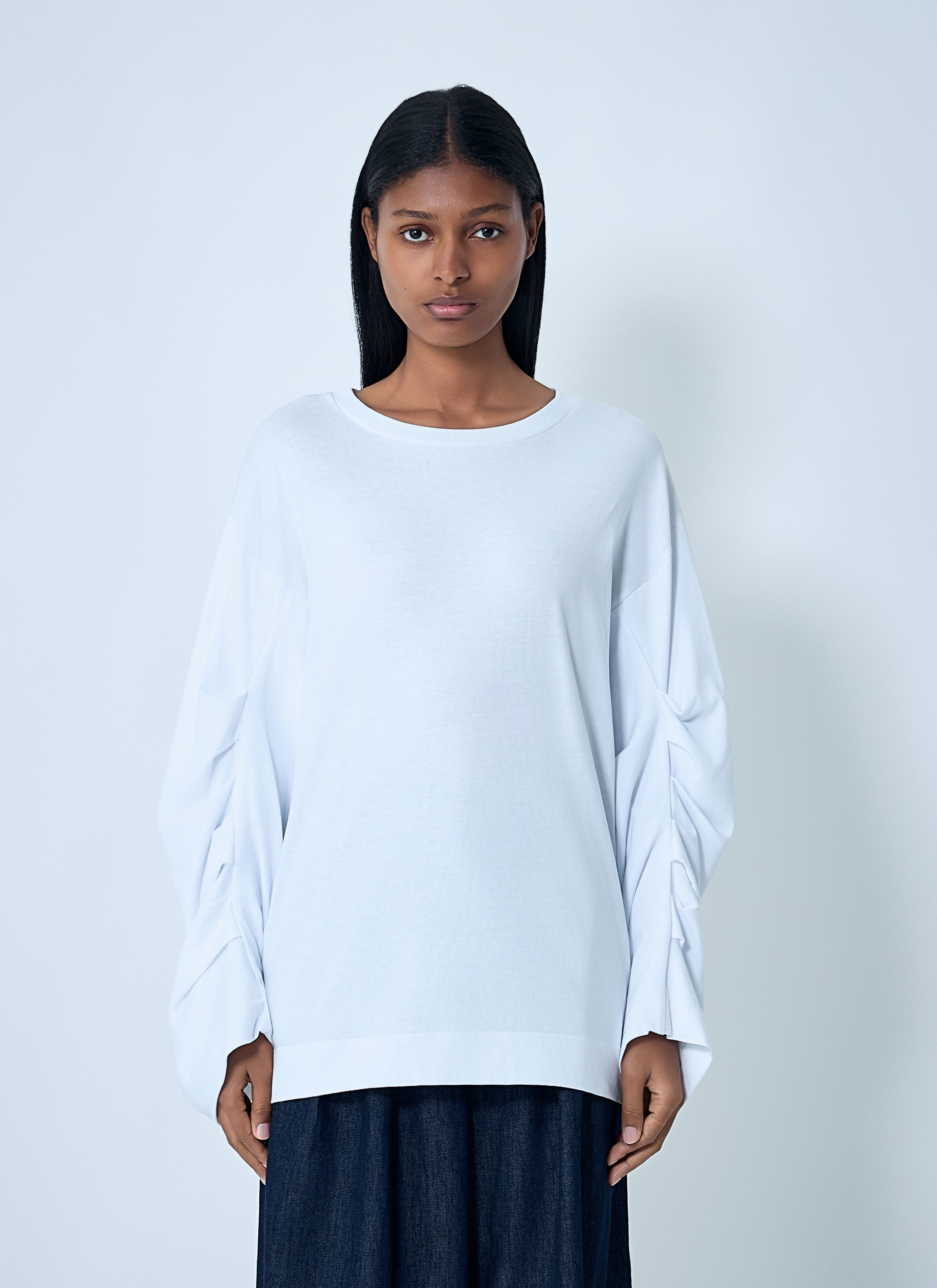 Cotton T-shirt with ruched sleeves. - Crewneck - Ruched long sleeves - 100% Cotton. Dry clean - Color: White - Code: 252-011110-2603-001