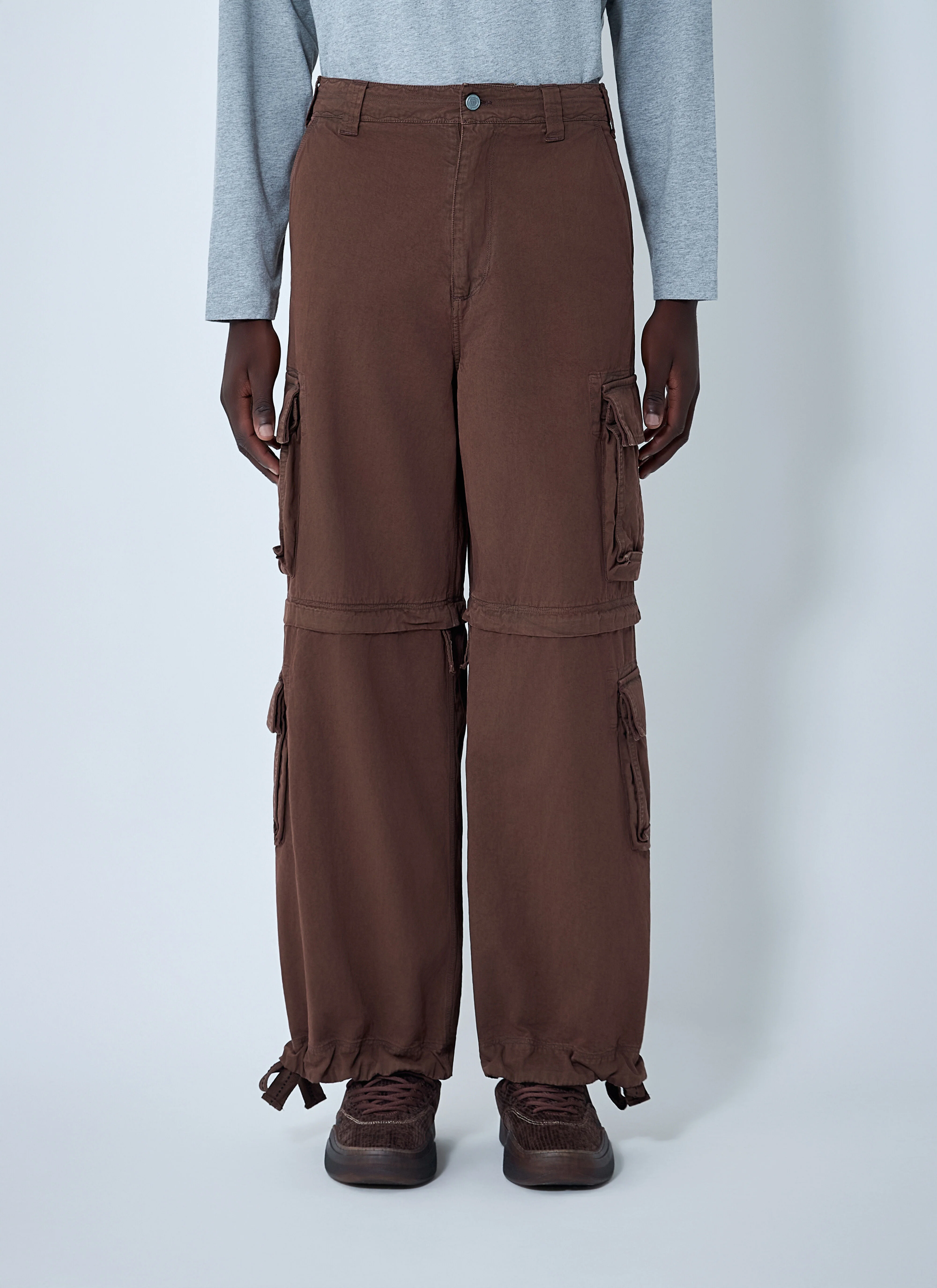 Cargo pants with zip fastening panels at knee. - Mid rise - Top-button and zip-fly fastening - Belt loops - Multiple pockets - Side logo patch - Drawstring hem - 100% Cotton. Specialist clean - Color: Brown - Code: ERL11P006