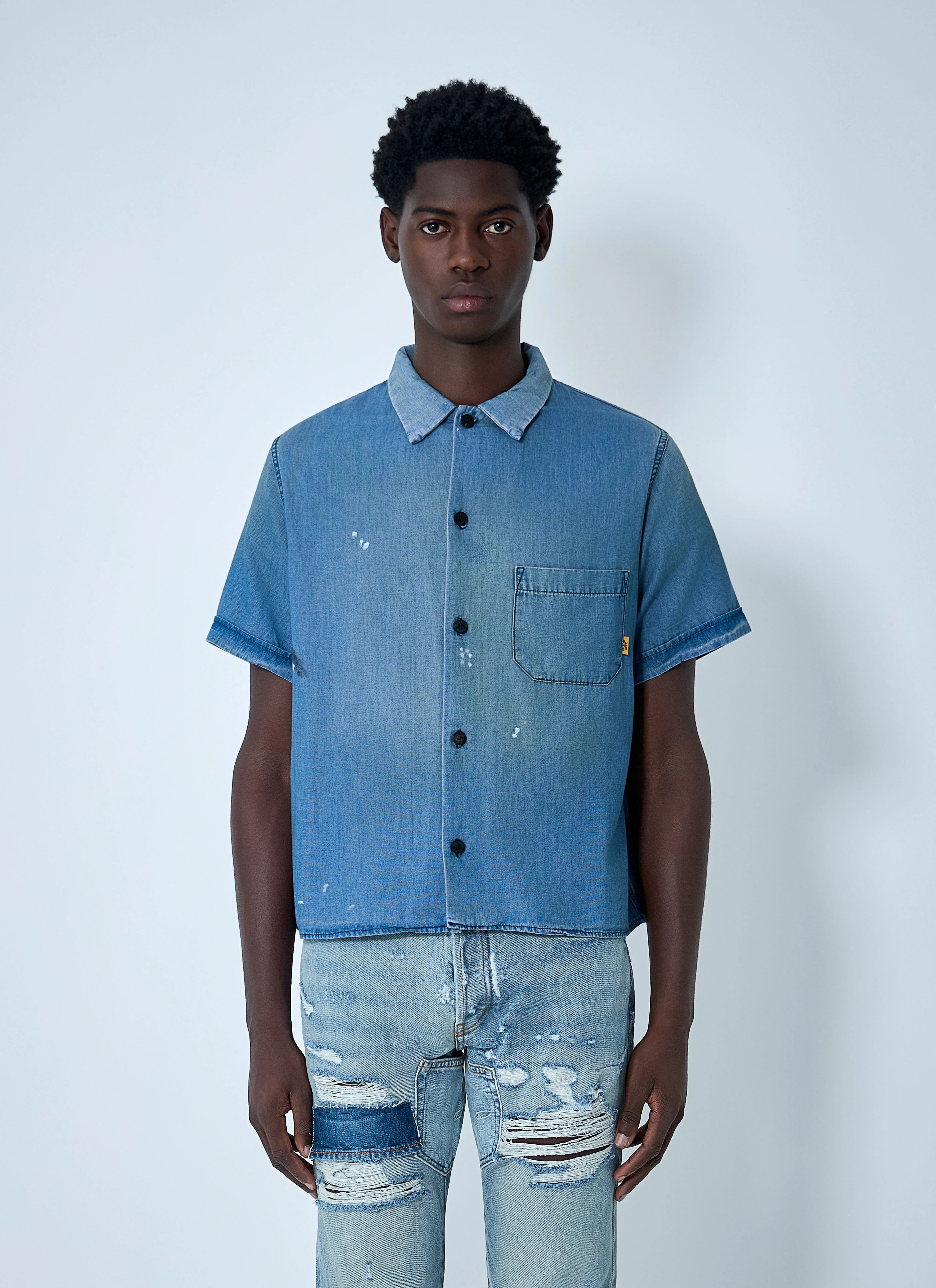 Button-down short sleeve shirt. - Classic collar - Front button fastening - Short sleeves - Chest patch pocket - Rear text motif - 100% Cotton. Machine wash cold - Color: Blue - Code: BS-60009