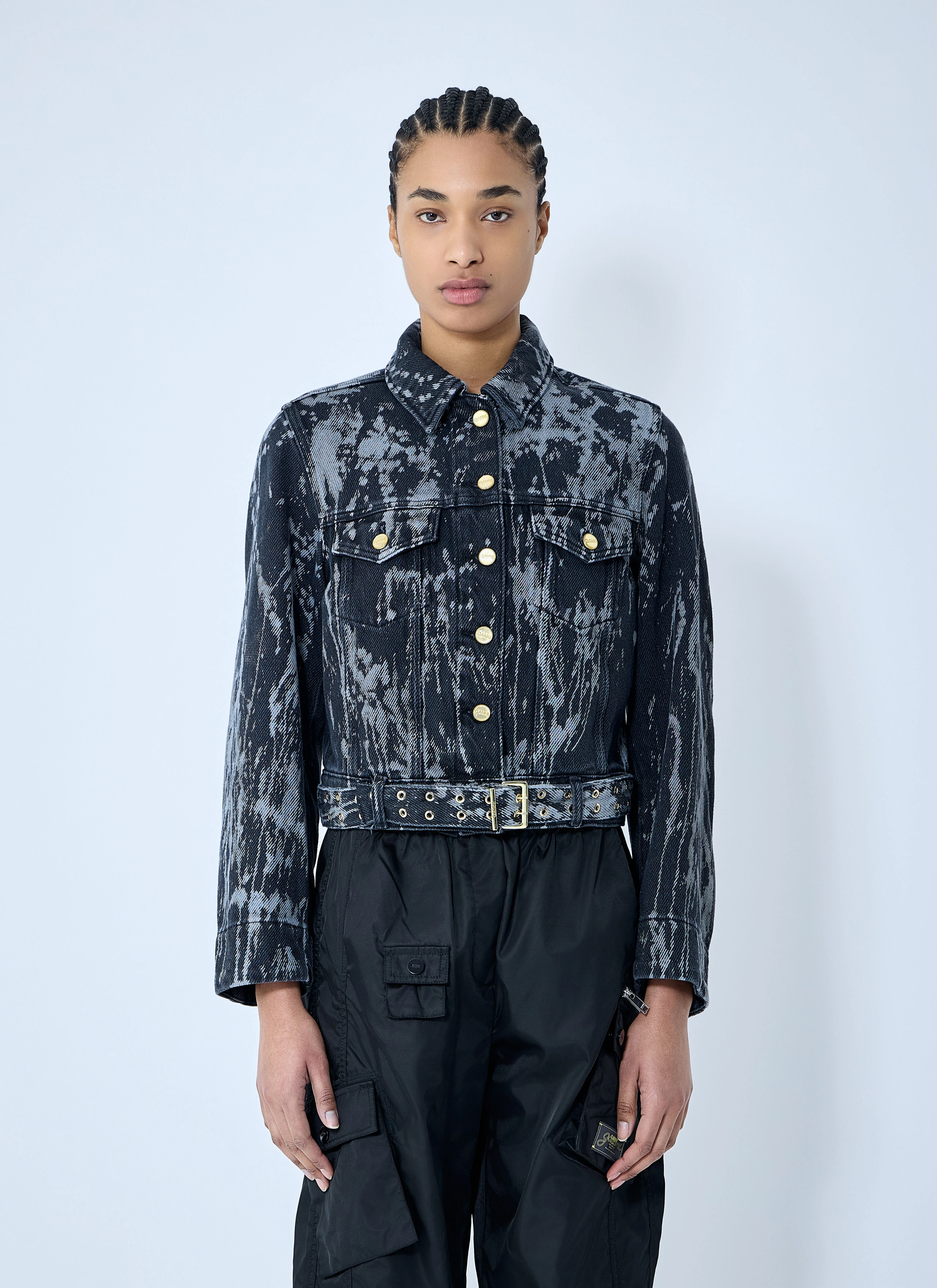 Printed denim jacket with belted construction at hem. - Classic collar - Front button fastening - Long sleeves - Front button fastening pockets - Belt loops at hem - Detachable belt at hem - 100% Cotton. Dry clean - Color: Blue - Code: J1599 006