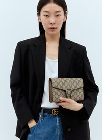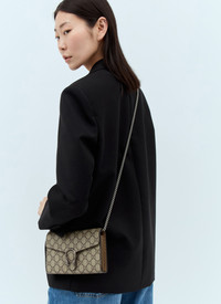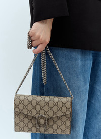 Dionysus Supreme chain shoulder bag in canvas with front Dionysus hardware. - Chain shoulder strap - Front flap fastening with snap closure - Front signature tiger-head horseshoe plaque - Logo jacquard - Three main compartments - Internal zip pocket - Internal card slots - Made in Italy - 100% technical blend fabrication. - Color: Beige - Code: 401231 KHNSN 8642