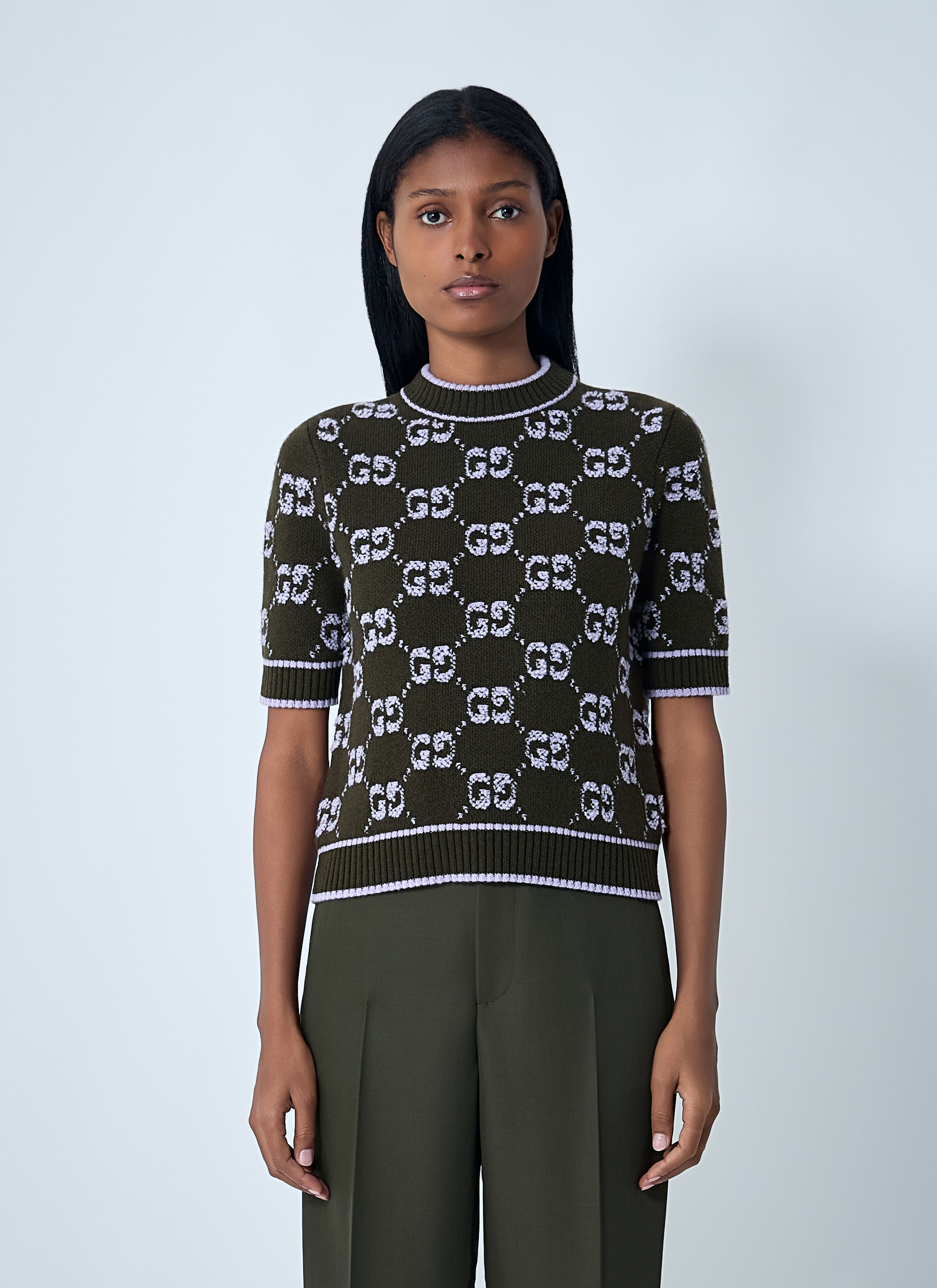 Short sleeve sweater in GG jacquard wool boucle. - Crewneck - Short sleeves - Rib trims - 100% Wool. Dry clean - Color: Green - Code: 770059 XKCNA 3039