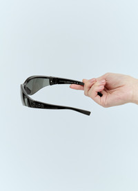 Mask-shaped frame sunglasses with logo at nose bridge. - Wraparound frames - Tinted lenses - Raised logo at nose bridge - Logo motif at temples - 100% UVA/UVB protection - 100% Injected - Color: Black - Code: 779494 J1691 1012
