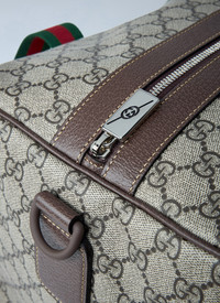 Medium duffle bag with all-over GG motif and Web trims. - Adjustable leather strap - Twin handles - Top zip fastening - One main compartment - Web stripe trims - 100% Technical Fabrication Blend - Color: Beige - Code: 758664 FACK7 9768
