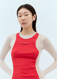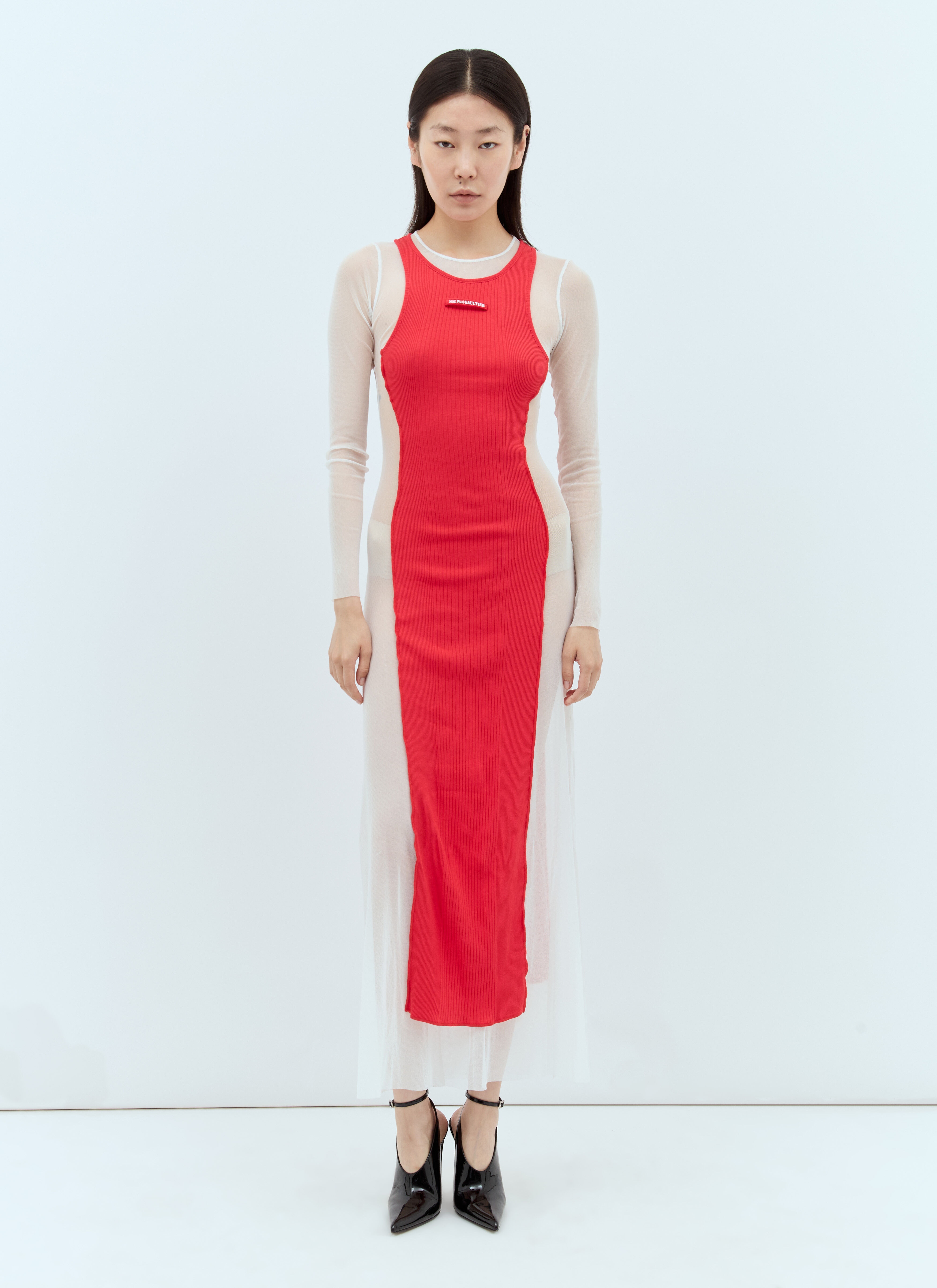 Petit Grand maxi dress in panel construction. Part of the Fashion Fiction Collection. - Crewneck - Long sleeves - Front logo patch - Semi sheer side panels - 100% Polyamide. Contrast: 100% Cotton. Hand wash - Color: Red - Code: 24/30-F-RO191B-T001-0130