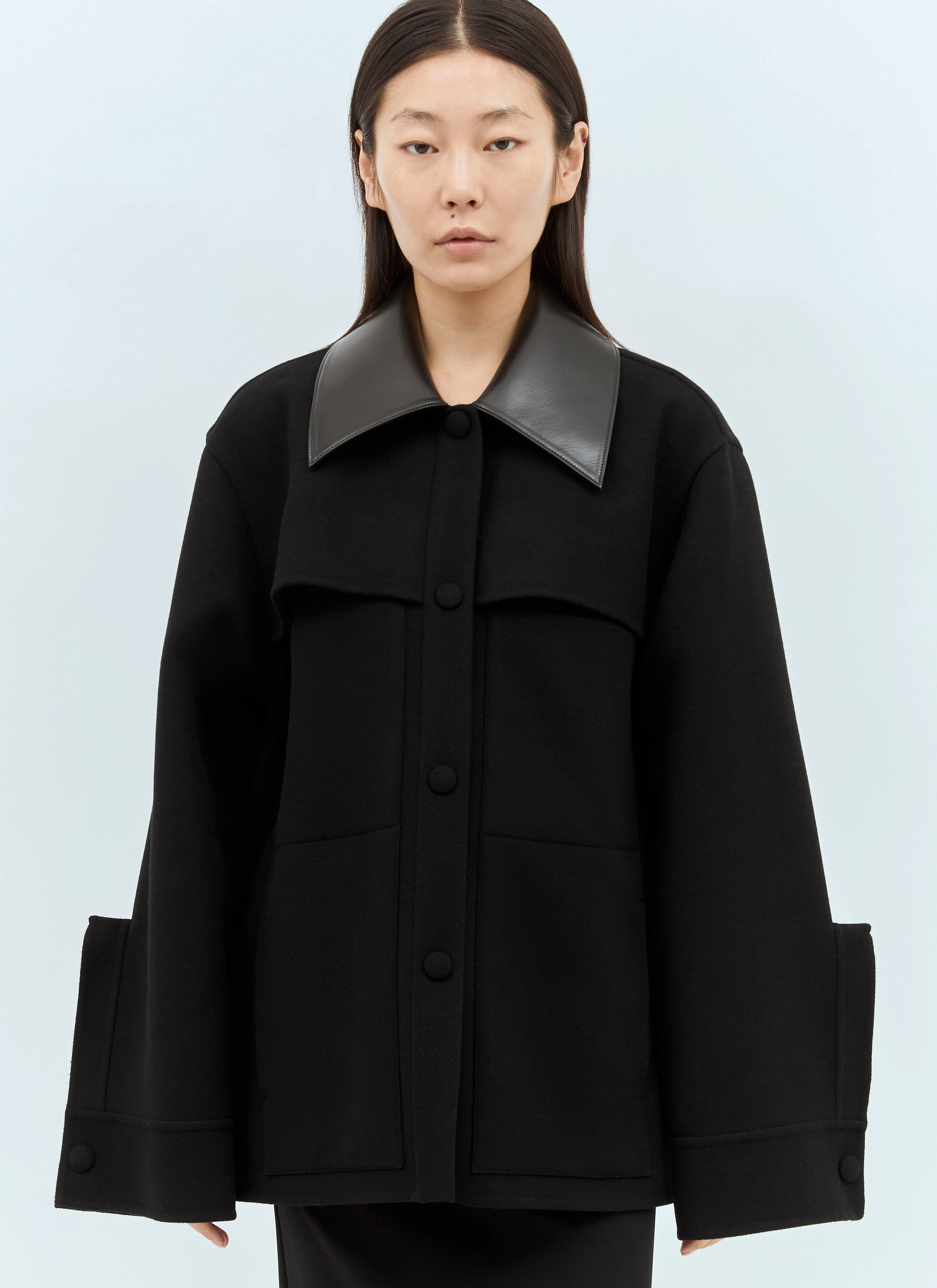 Wool overshirt with leather collar and raised placket at cuffs. - Spread collar - Front button fastening - Long sleeves - Button-fastening cuffs - Side slip pockets - Made in Italy - 100% Wool. Contrast: 100% Leather. Dry clean - Color: Black - Code: J02BN0199 J40035 001