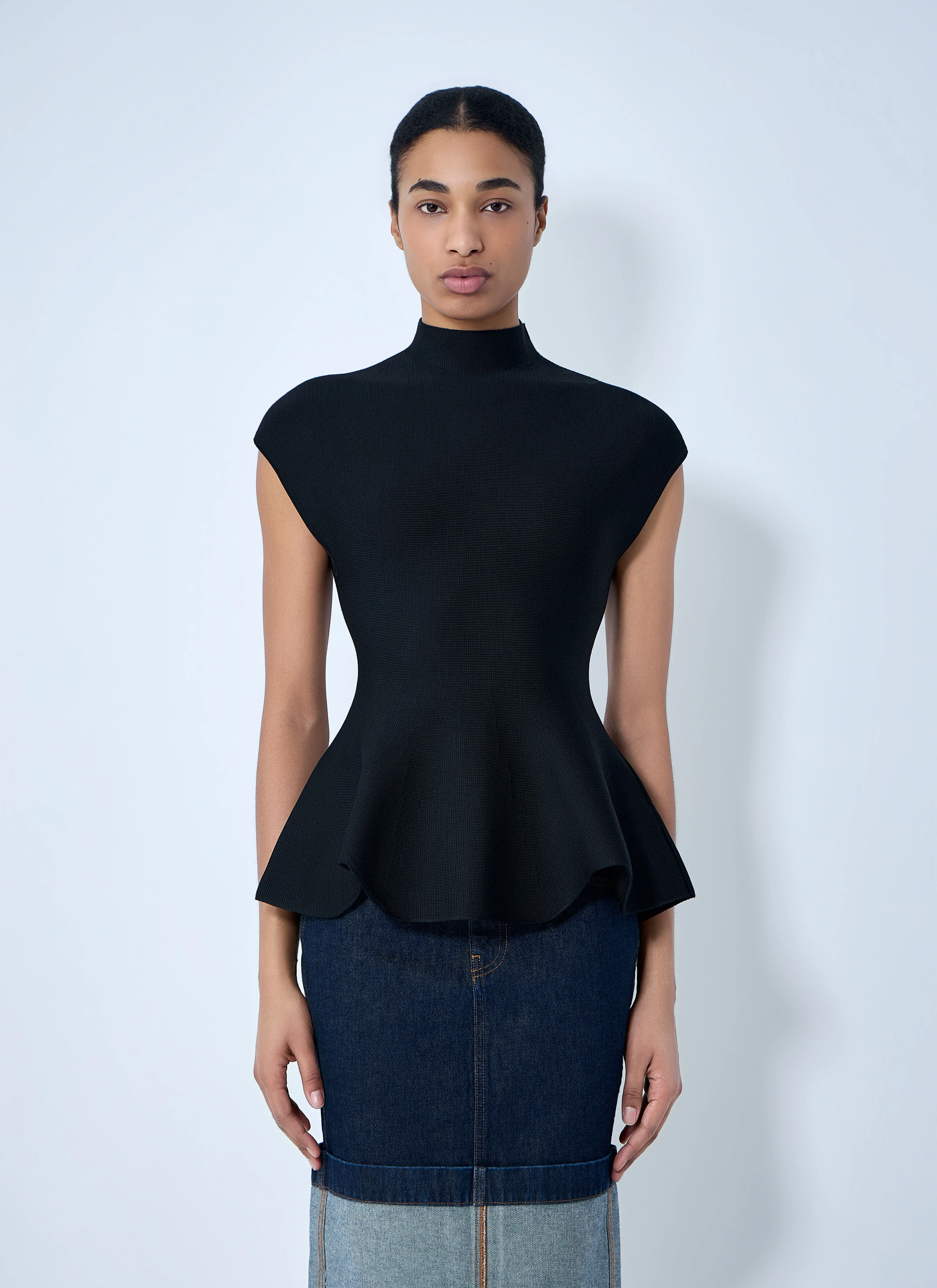 Sleeveless top with structured knit and peplum hem. - High neckline - Sleeveless design - Peplum hem - 85% Viscose, 13% Polyamide, 2% Elastane - Color: Black - Code: 9806429-200