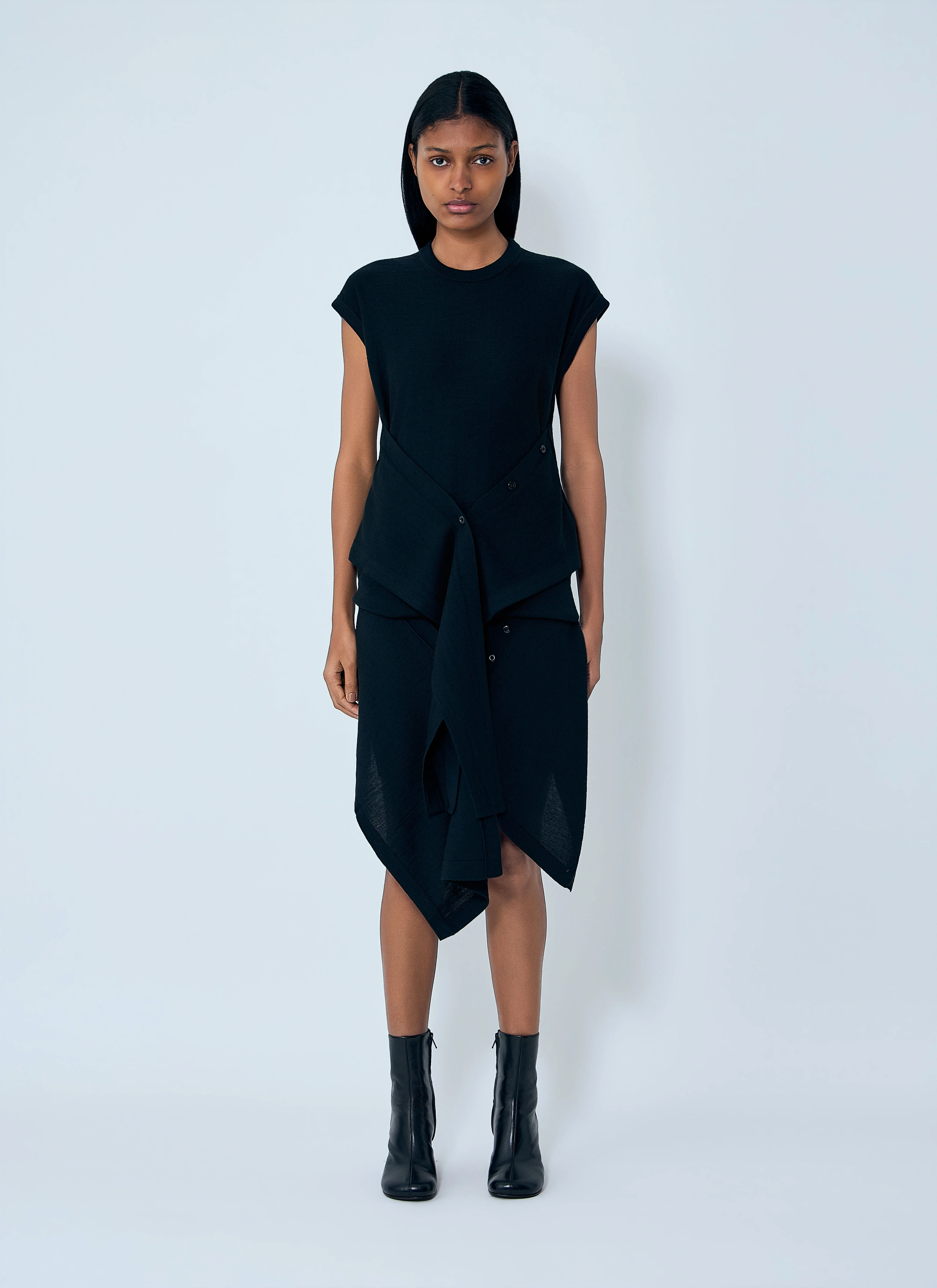 Sleeveless dress with asymmetrical layered construction and button detailing. - Sleeveless design - Asymmetrical layered hem - Side button detailing - 50% Wool 50% Acrylic. Hand wash. - Color: Black - Code: PO0002 LK087 BK999