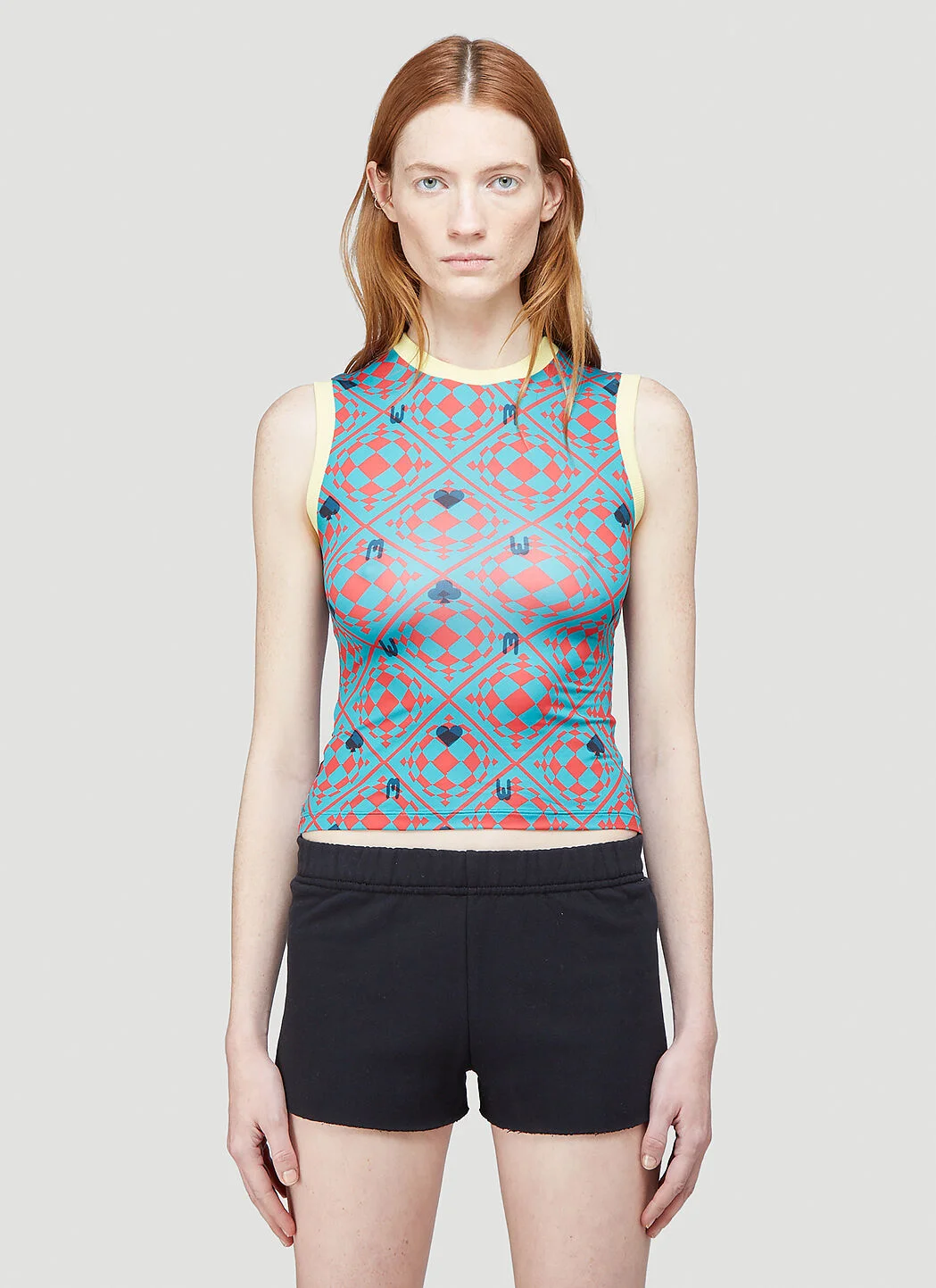 Maisie Wilen provides a deft mix of art-school flare with disciplined calibration shimmering with ’90s-era euphoria for evening, or stands fortified with strong, saleable sportswear for day. The Knitted Muscle Beach Tank Top is crafted from a technical blend fabrication in a stretch weave, featuring all-over graphic print motif, crewneck and straight hem. - Technical blend fabrication in a knit-stretch weave - All-over graphic print motif - Crewneck - Straight hem - Sleeveless - 83% Polyester, 17% Spandex. Dry clean. - Color: Blue - Code: SS21YS119SS21
