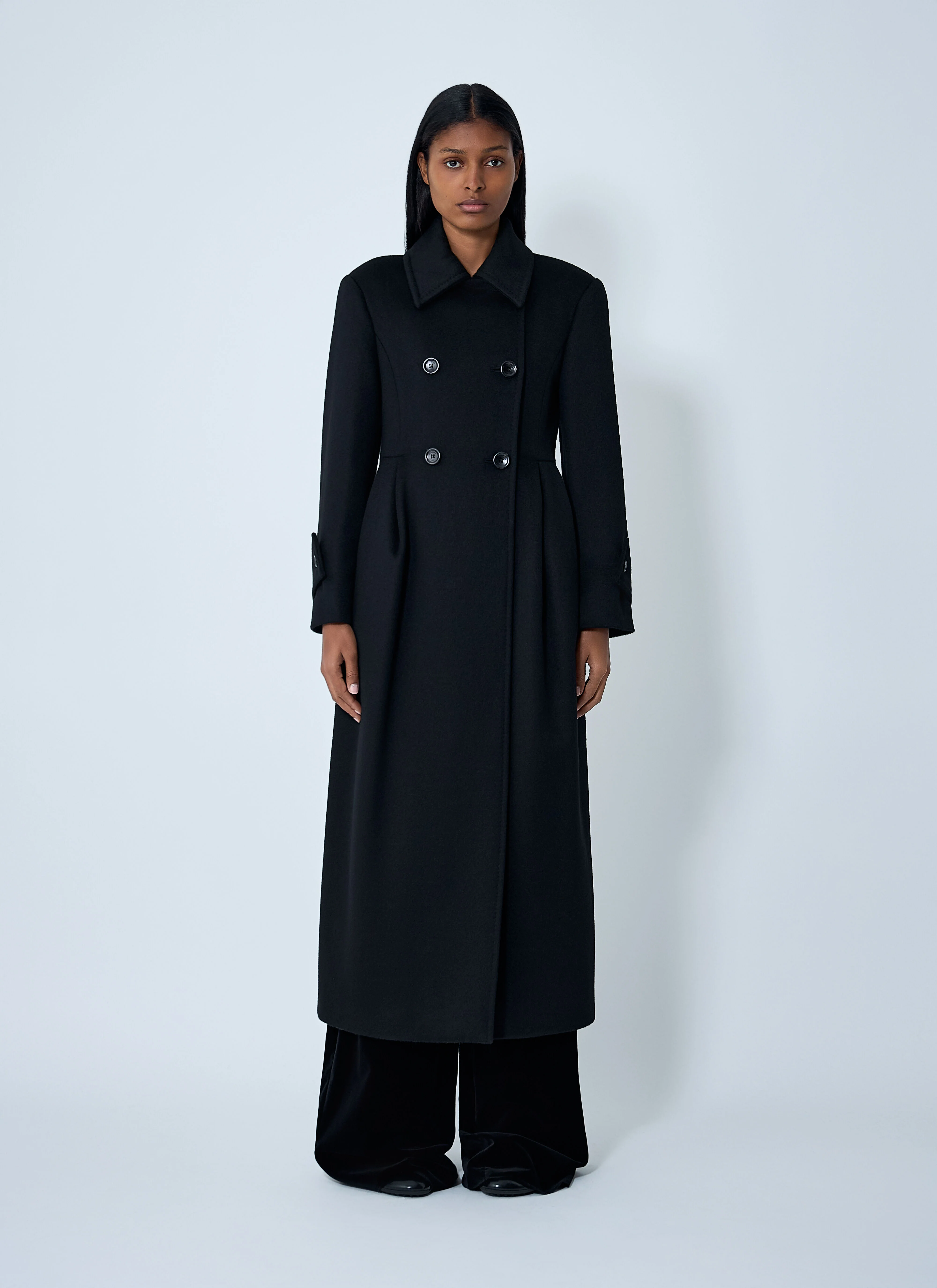 Long double-breasted coat with structured silhouette. - Notched lapels - Double-breasted button fastening - Long sleeves - Side slip pockets - Buttoned cuffs - 100% Camelwool. Dry clean - Color: Black - Code: 2521016483600 003
