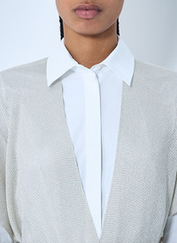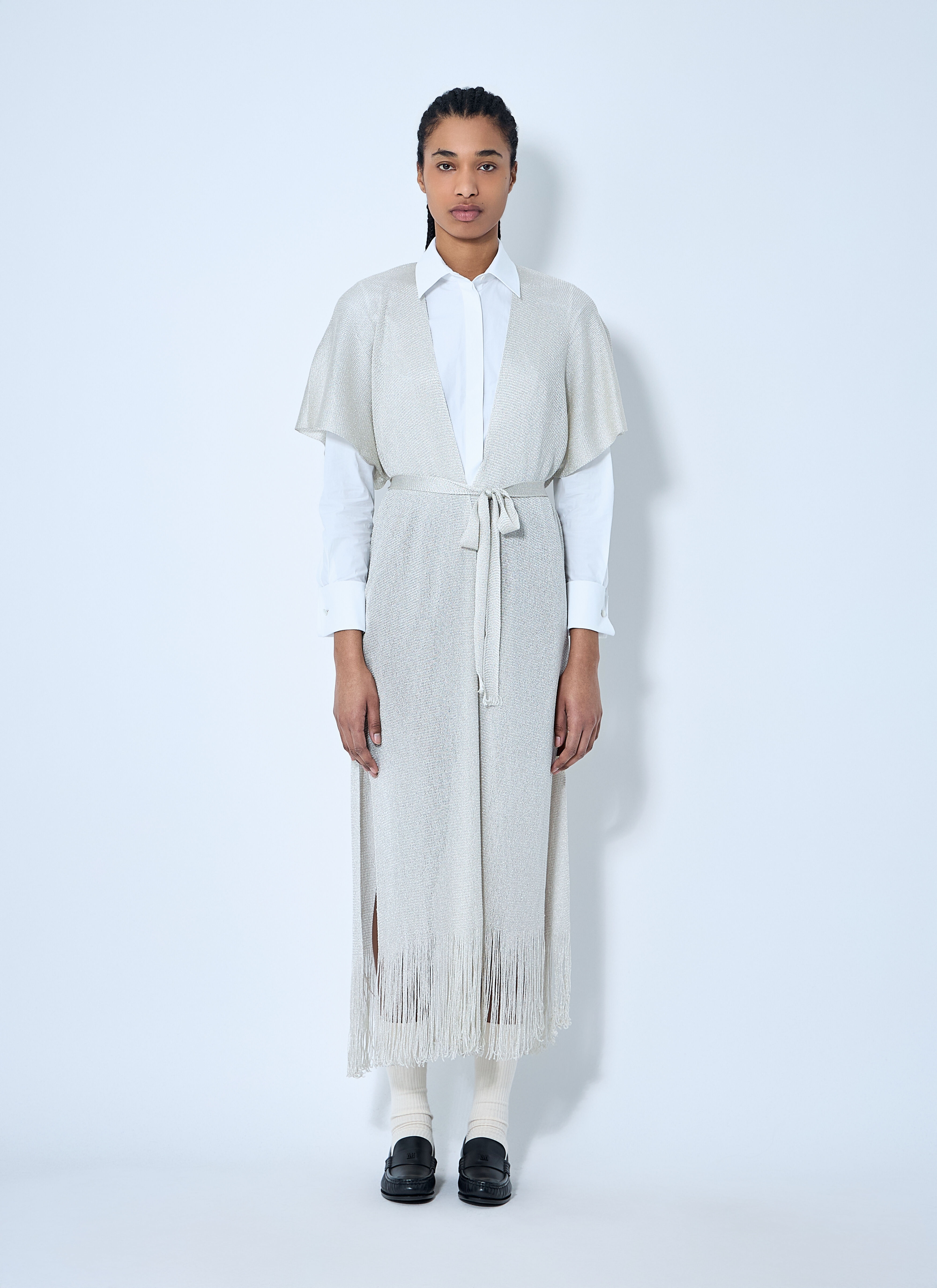 Knit cardigan with a detachable belt and fringe hem. - V neck - Draped cap sleeves - Belt loops - Detachable belt - Fringe hem - 80% Viscose, 10% Polyamide, 10% Metallised Fibers. Hand wash - Color: White - Code: 2516691029670 001
