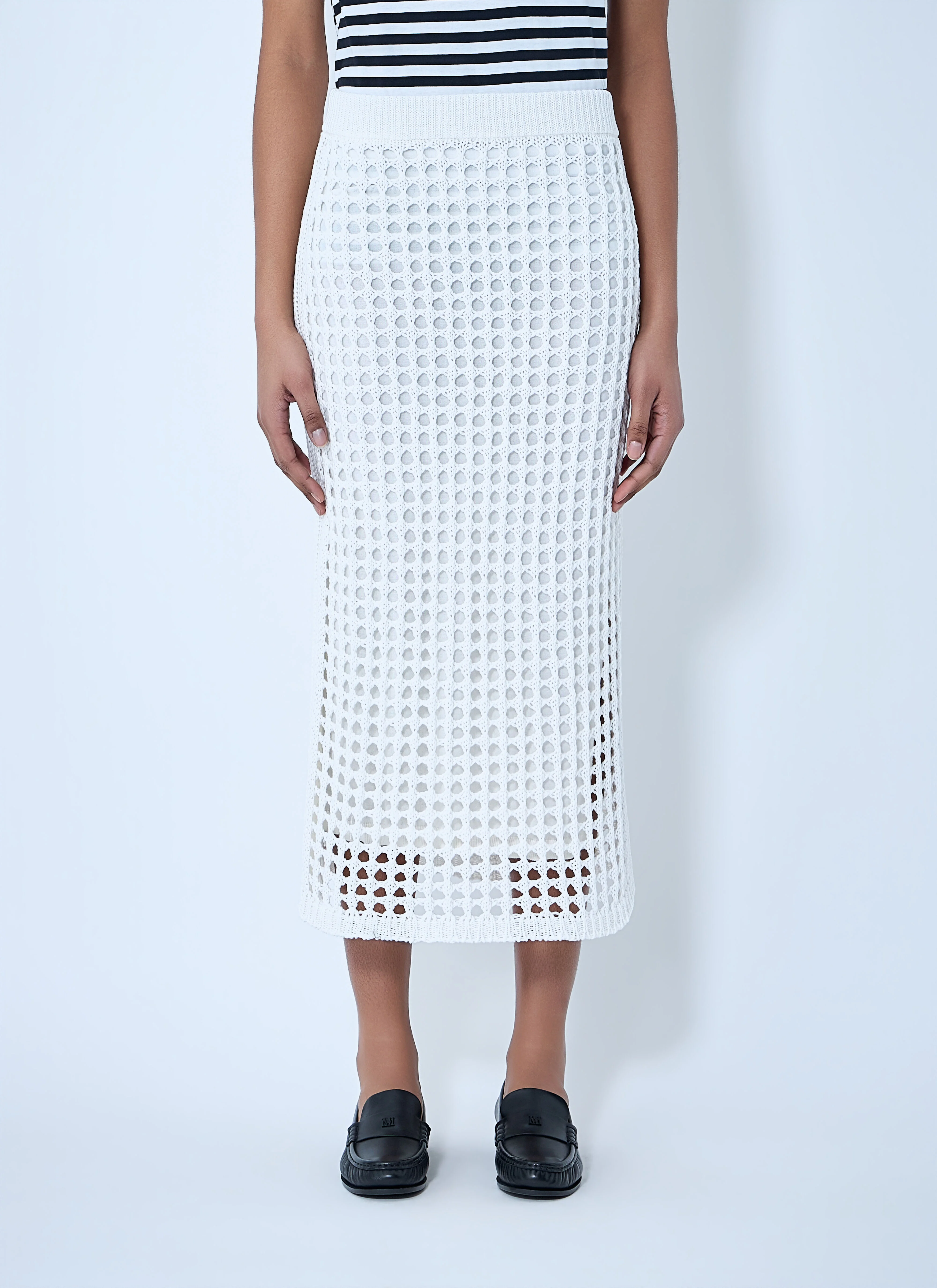 Midi skirt with open-knit crochet construction. - Elasticated waistband - Semi-sheer finish - Mid length - 100% Cotton - Color: White - Code: 2611301029600 001