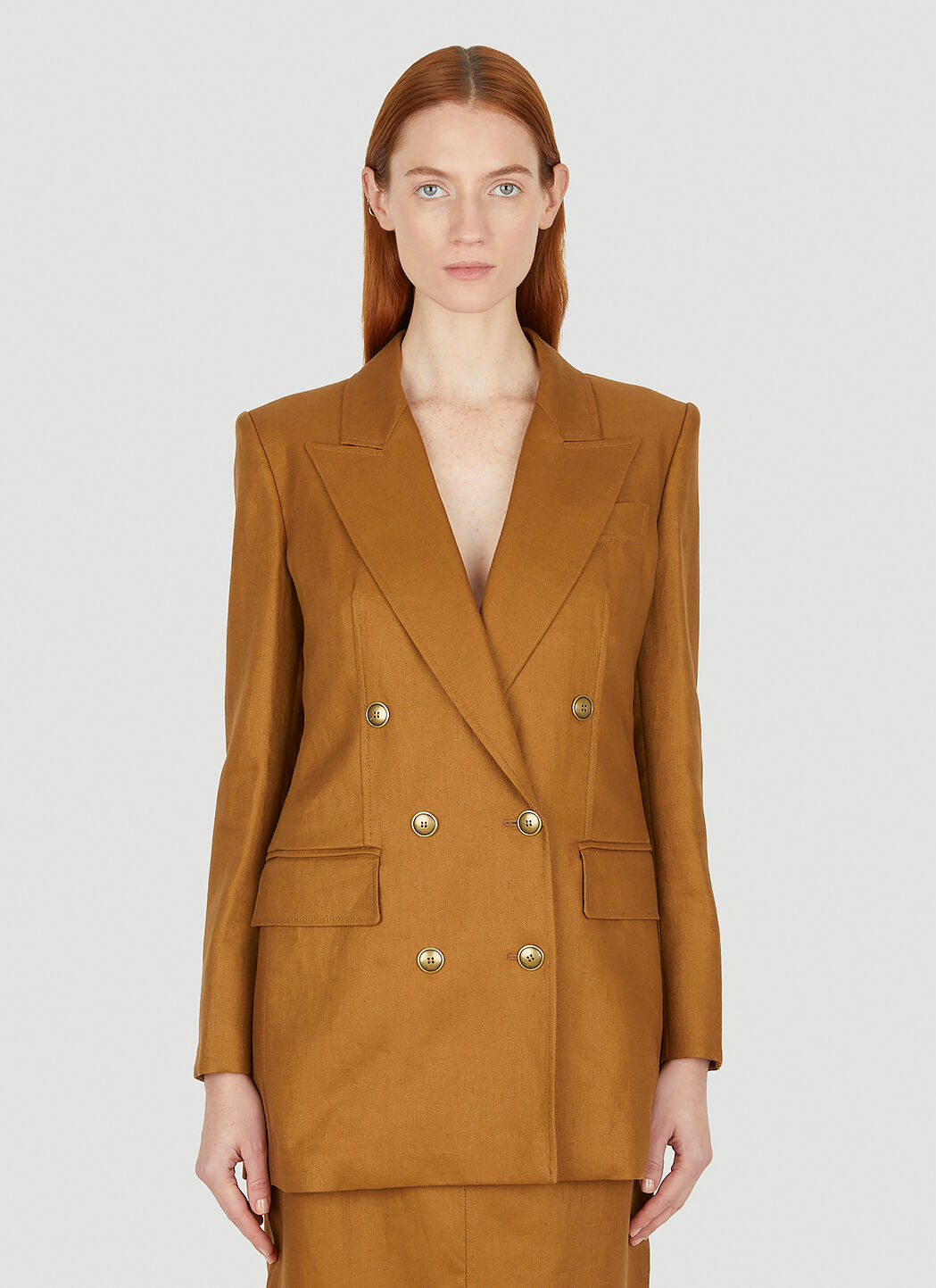 - Linen in a close weave - Notch lapels - Double-breasted button fastening - Long sleeves - Front flap pockets - Contrast topstitching - Single vent at rear - 100% Flax linen. Hand wash - Color: Brown - Code: 2310410132600 002