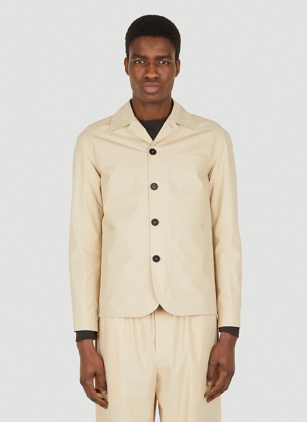 - Organic cotton in a poplin weave - Revere collar - Dropped shoulders - Long sleeves - Front patch pocket - Single rear vent - Made in Italy - 100% Organic Cotton. Dry clean - Color: Beige - Code: PAJ003-COCO002-FCC