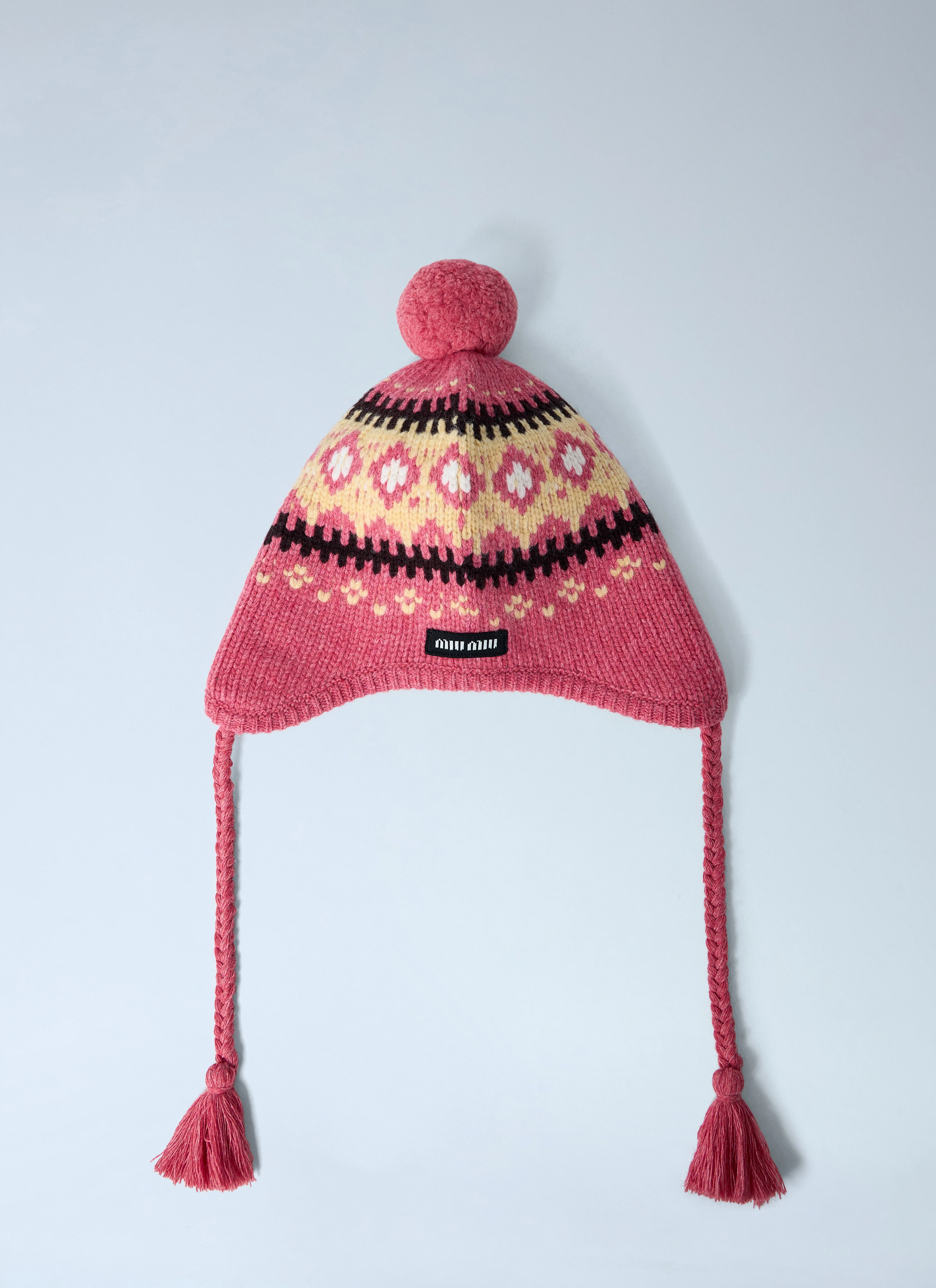 Knitted hat with pom-pom and ear flaps. - Intarsia knit construction - Crochet tassels - Branded patch - 100% Wool - Color: Pink - Code: 5HC488 18SI F0028