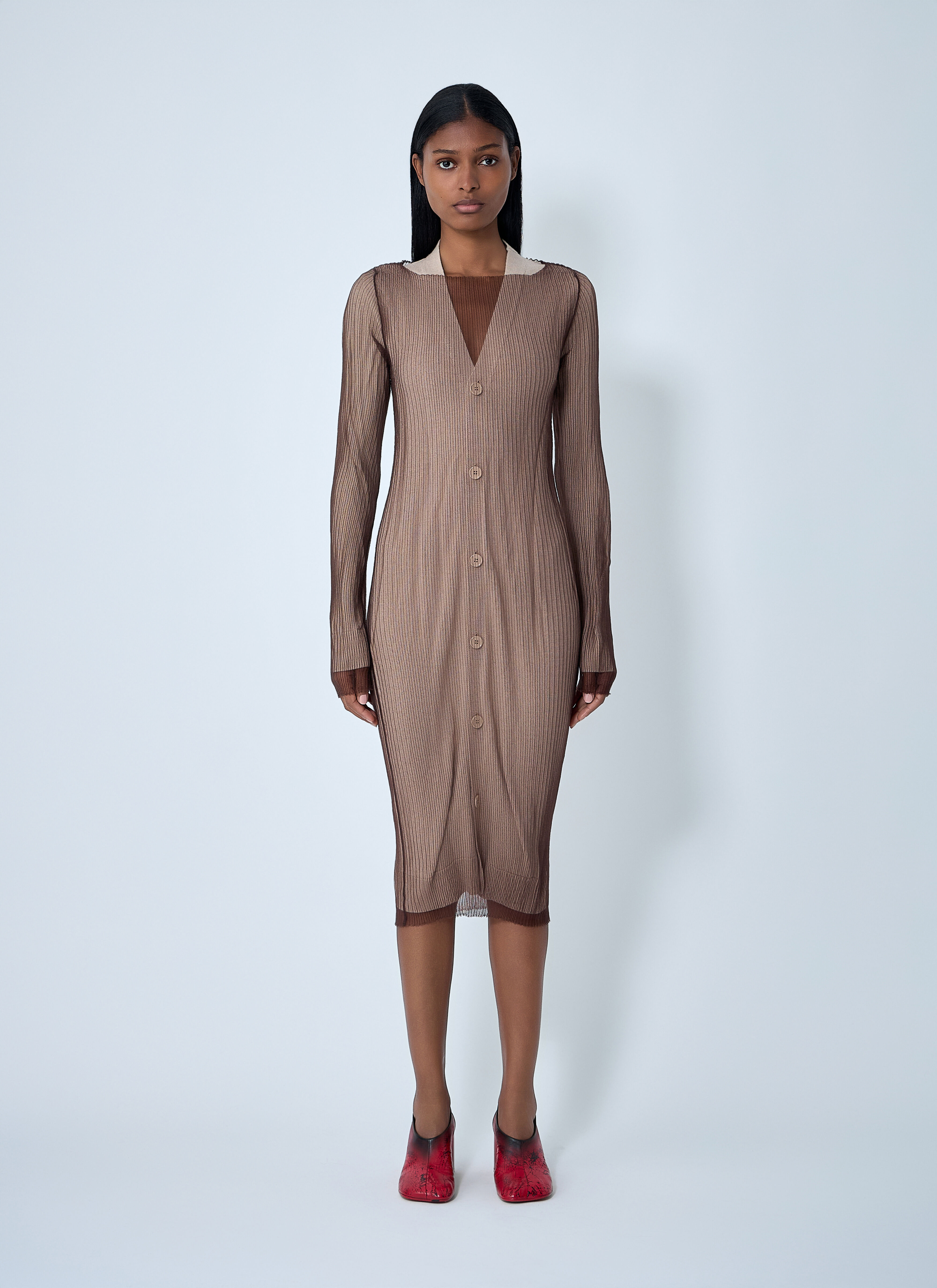 Layered wool cardigan with mesh overlay. - V neck - Front button fastening - Long sleeves - Mesh overlay - 100% Wool. Hand wash - Color: Brown - Code: S62HP0033 M13191 961