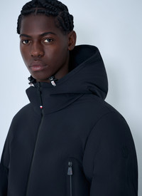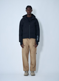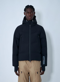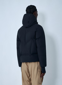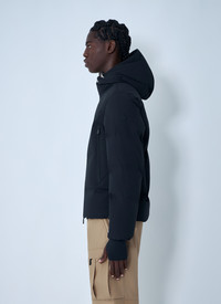 Short down jacket with side logo motif. - Hood - Front zip fastening - Long sleeves - Side zip fastening pockets - Zip fastening pockets at sleeve - Logo motif at sleeve - Extended cuffs - 100% Technical Fabrication Blend. Fill: 90% Down, 10% Feathers. Dry clean - Color: Black - Code: 1A00018 597S3 999