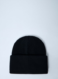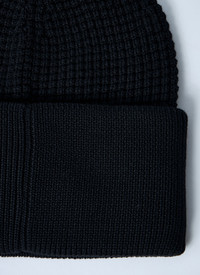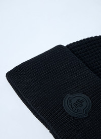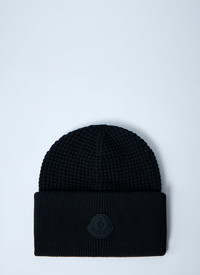 Logo motif beanie hat in wool knit. - Round crown - Folded brim - Front logo motif - 100% Wool - Color: Black - Code: 3B00032 M1367 999