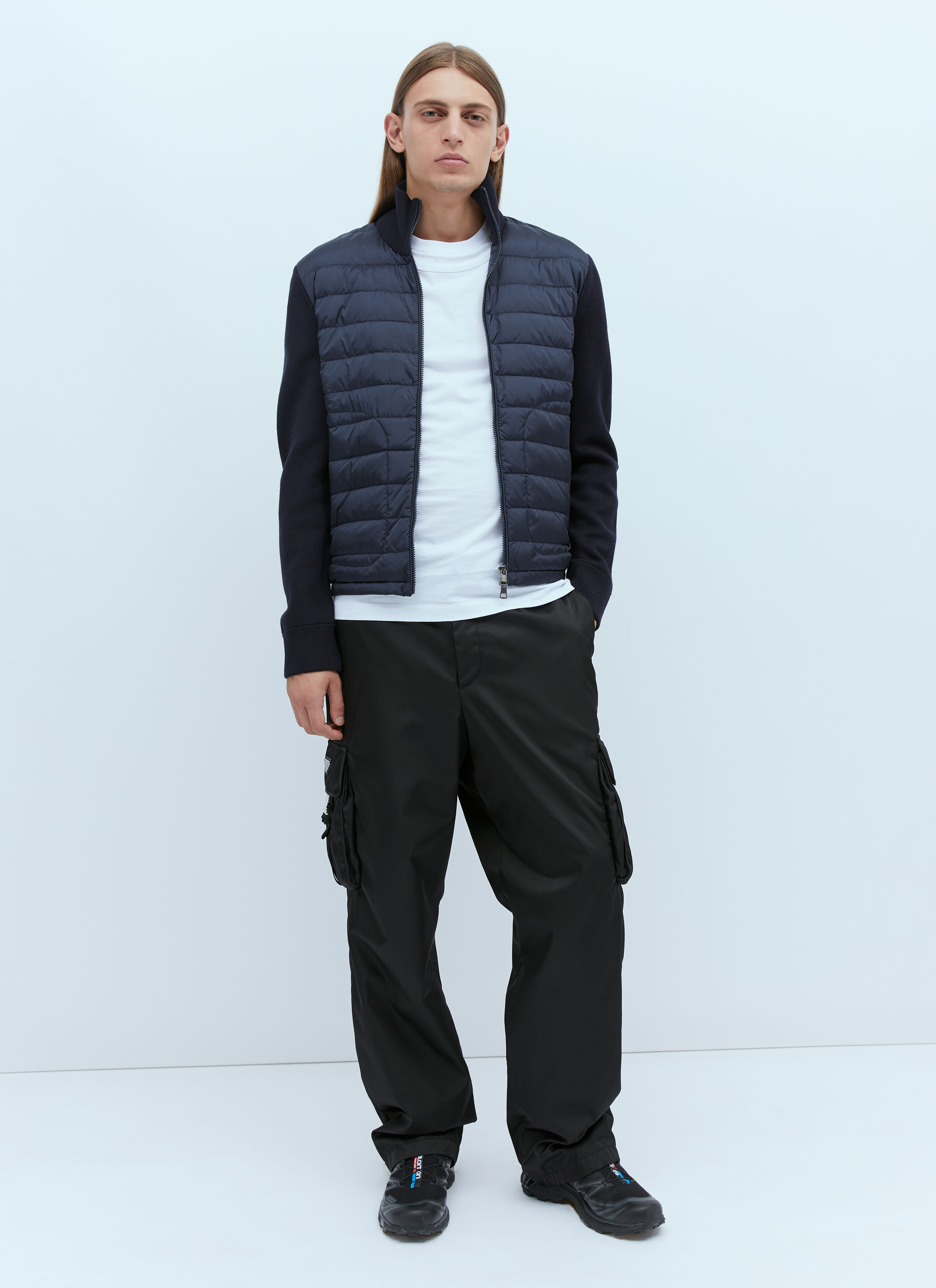 Quilted bodice with knit sleeves cardigan. - Stand collar - Front zip fastening - Knit long sleeves - Side slip pockets - Logo patch at side - 100% Nylon. Contrast: 50% Acrylic, 50% Virgin wool. Dry clean - Color: Navy - Code: 9B50700 A9341 777