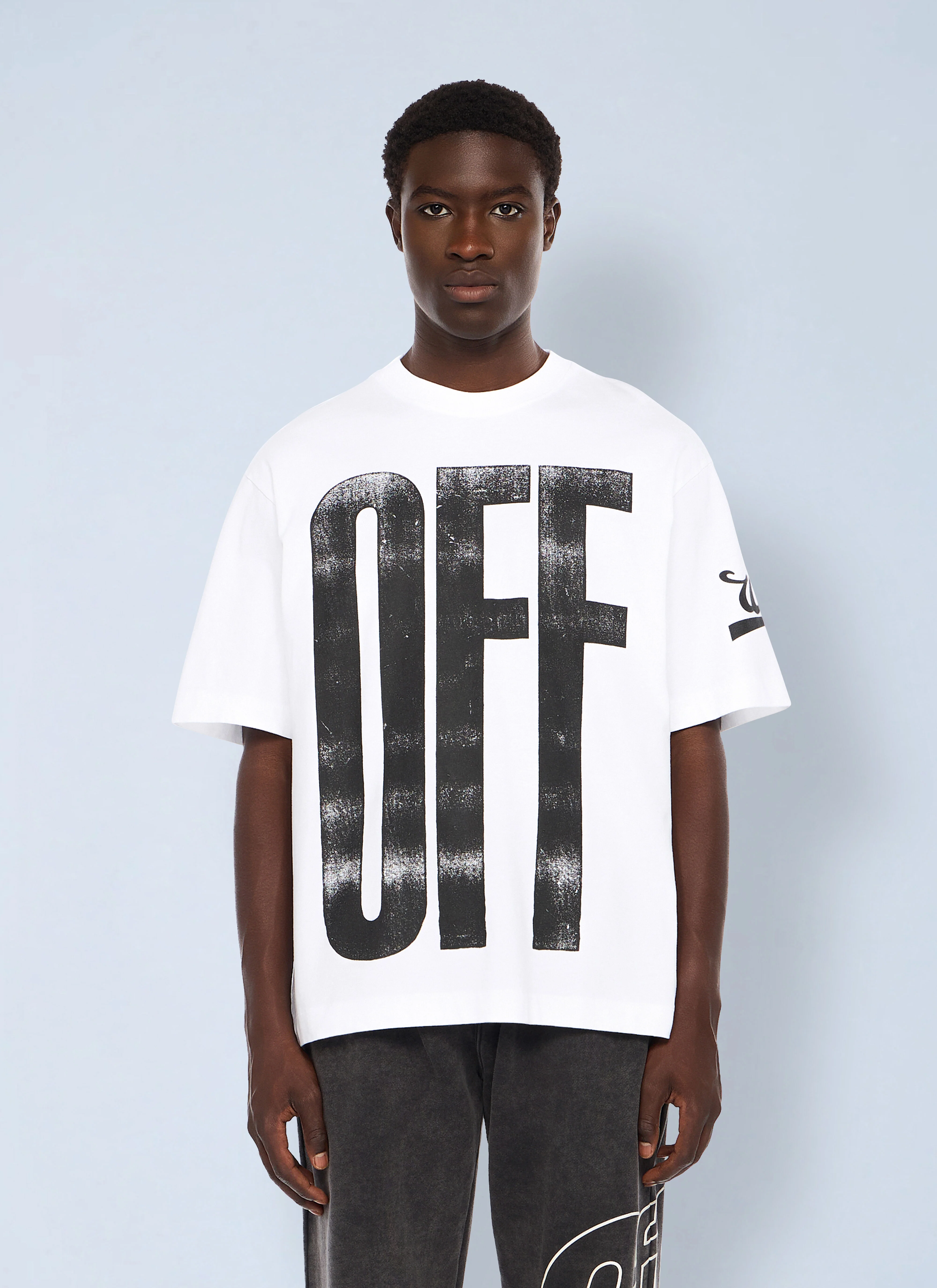 Cotton t-shirt with OFF graphic and diagonal stripe back motif. - Short sleeves with crewneck - Front OFF graphic - Back diagonal stripe motif - Relaxed silhouette - Branding at sleeve - 100% Cotton. Rib Details: 95% Cotton, 5% Elastane. Dry clean - Color: White - Code: OMAA120F25JER00L0110