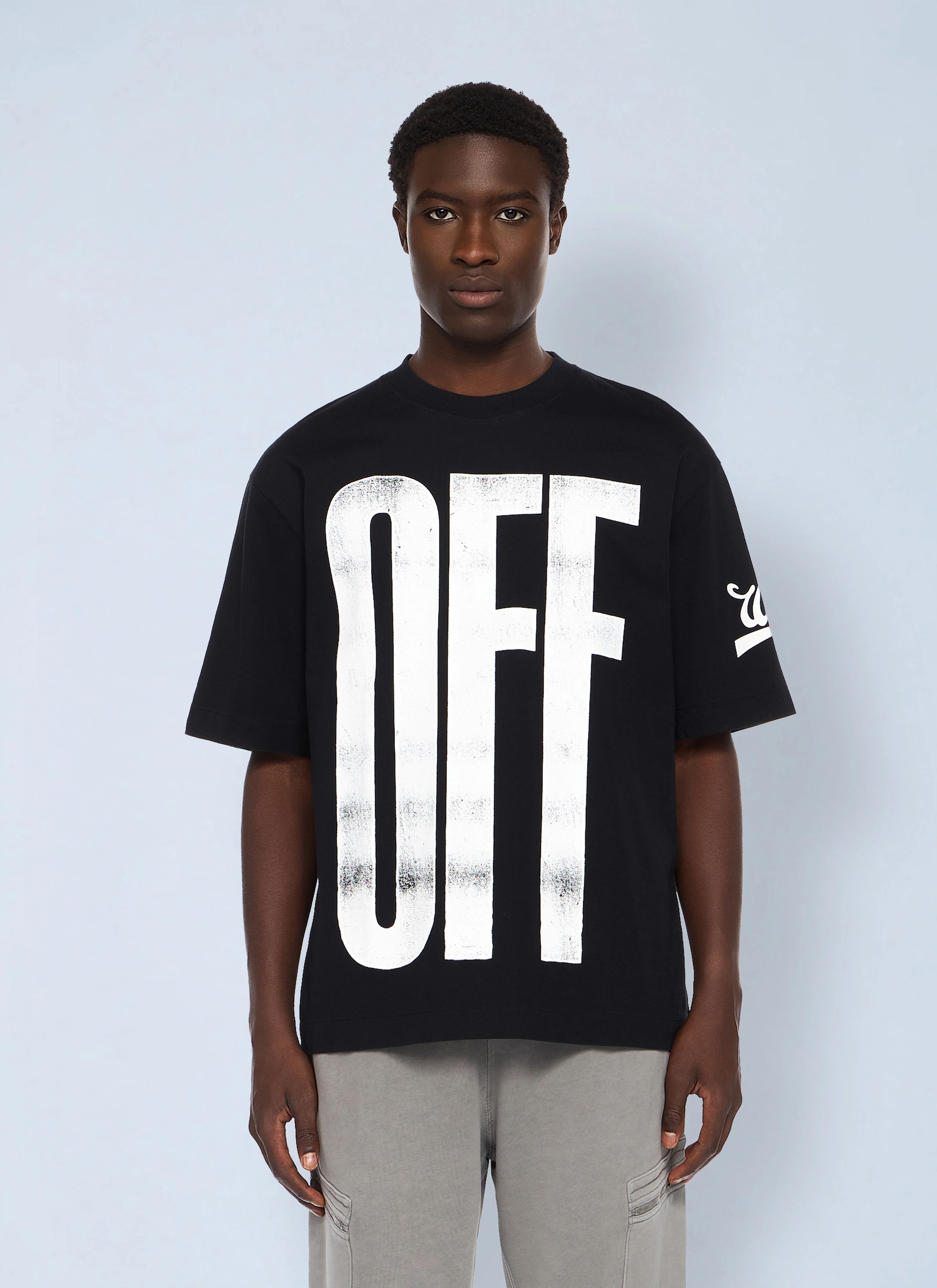 Cotton t-shirt with OFF graphic and diagonal stripe back motif. - Short sleeves with crewneck - Front OFF graphic - Back diagonal stripe motif - Relaxed silhouette - Branding at sleeve - 100% Cotton. Rib Details: 95% Cotton, 5% Elastane. Dry clean - Color: Black - Code: OMAA120F25JER00L1001