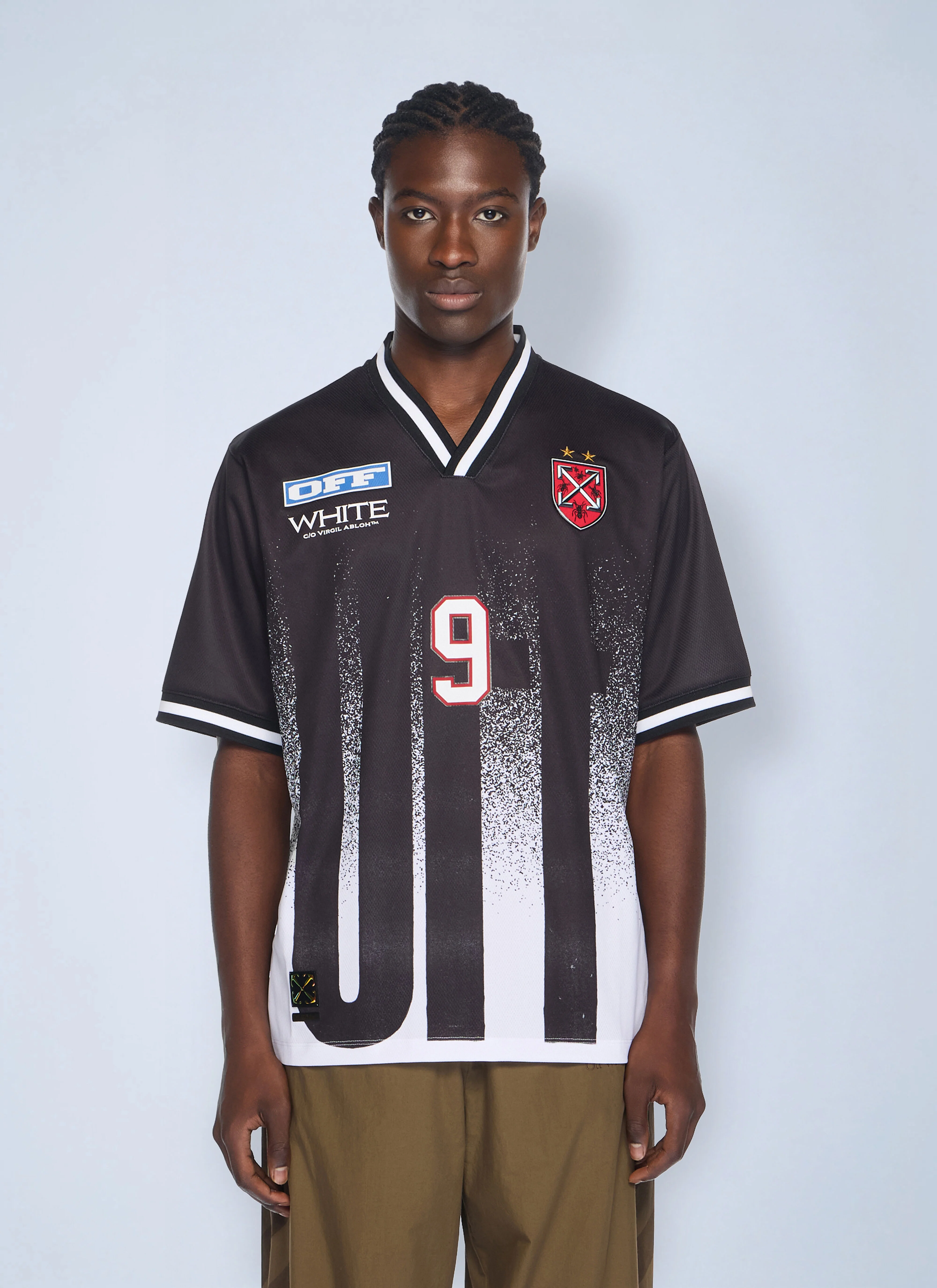 Lightweight soccer-style jersey with gradient graphic and arrow motif. - V-neckline with contrast trim - Short sleeves with striped cuffs - Front and back gradient graphic - Arrow motif at rear neckline - Lightweight breathable fabric - Oversized fit - Numerical and emblem details - 100% Cotton. Embroidery: 90% Polyester, 10% Viscose. Rib Details: 95% Cotton, 5% Elastane. Dry clean - Color: Black - Code: OMAD00SF25JER0041001