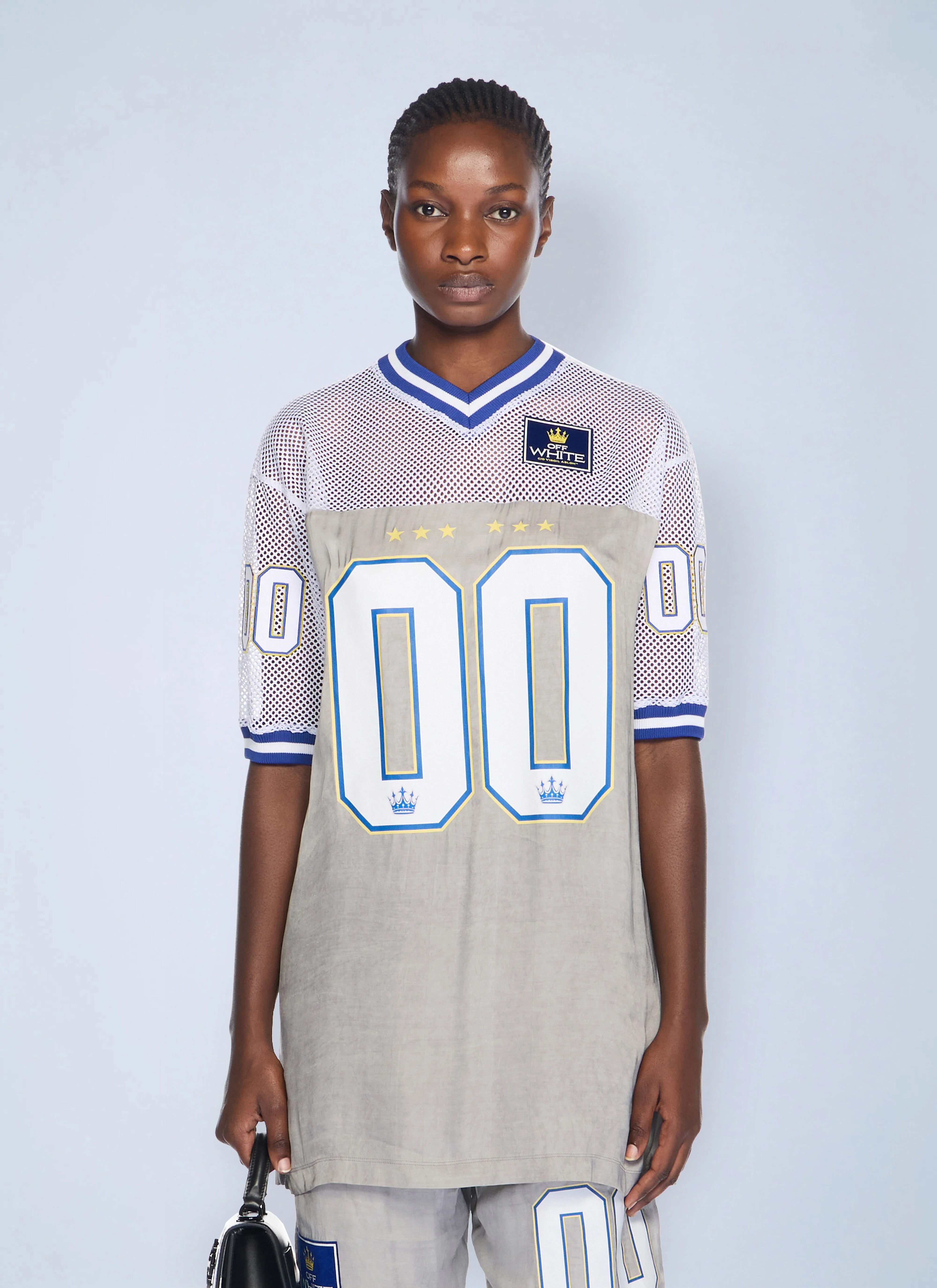 Mesh and satin football top with graphic motifs. - Mesh and satin construction - V-neckline with ribbed trim - Short sleeves with mesh overlay - Front and back graphics - Straight hem - Back branding - Made in Italy - 100% Viscose. Dry clean - Color: Blue - Code: OWDB55GF25FAB0010647
