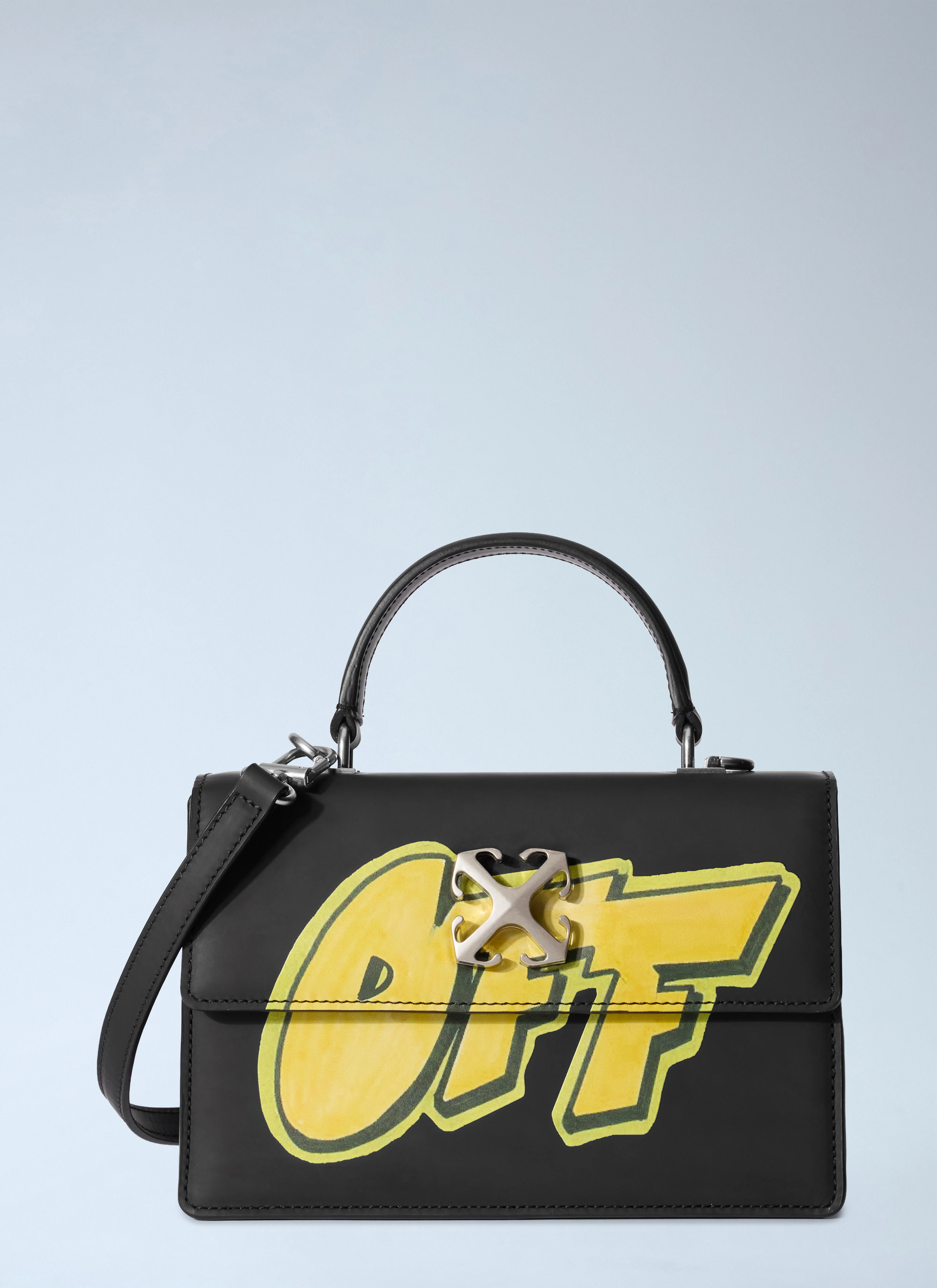Leather top-handle bag with graphic motif. - Flap-over construction - Graphic text and arrow motif at front - Adjustable and detachable shoulder strap - Magnetic closure - Rear slip pocket with debossed logo - Lined interior compartment - Made in Italy - 100% Leather - Color: Black - Code: OWNP062F25LEA0021018