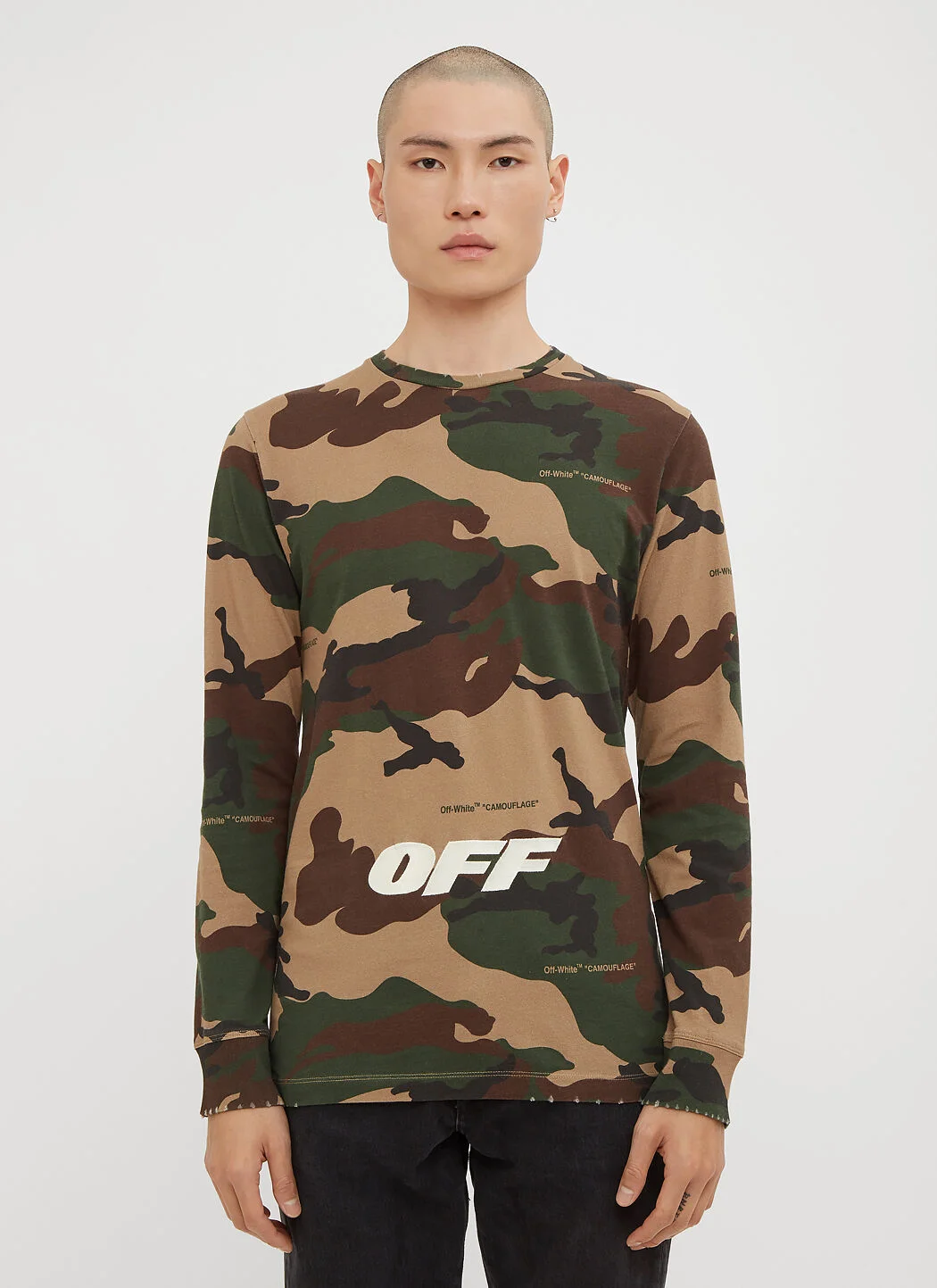 Virgil Ablohs Off-White describes itself as ‘Defining the grey area between black and white as the colour Off-White’. The street wear brand is recognised for tagging the garments with obvious titles in bold and quotation marks. The Long Sleeve Camo Print T-Shirt is crafted from cotton in a jersey weave, featuring a thick front white logo embroidery and small tonal logo and ‘camouflage’ graphics. - Cotton in a jersey weave - Front and back thick white embroidered logo detailing - All-over tonal logo and ‘camouflage’ print - Crew neck - Modern aesthetic - Made in Italy - 100% cotton. Machine wash - Color: Khaki - Code: OMAB001E181850219901