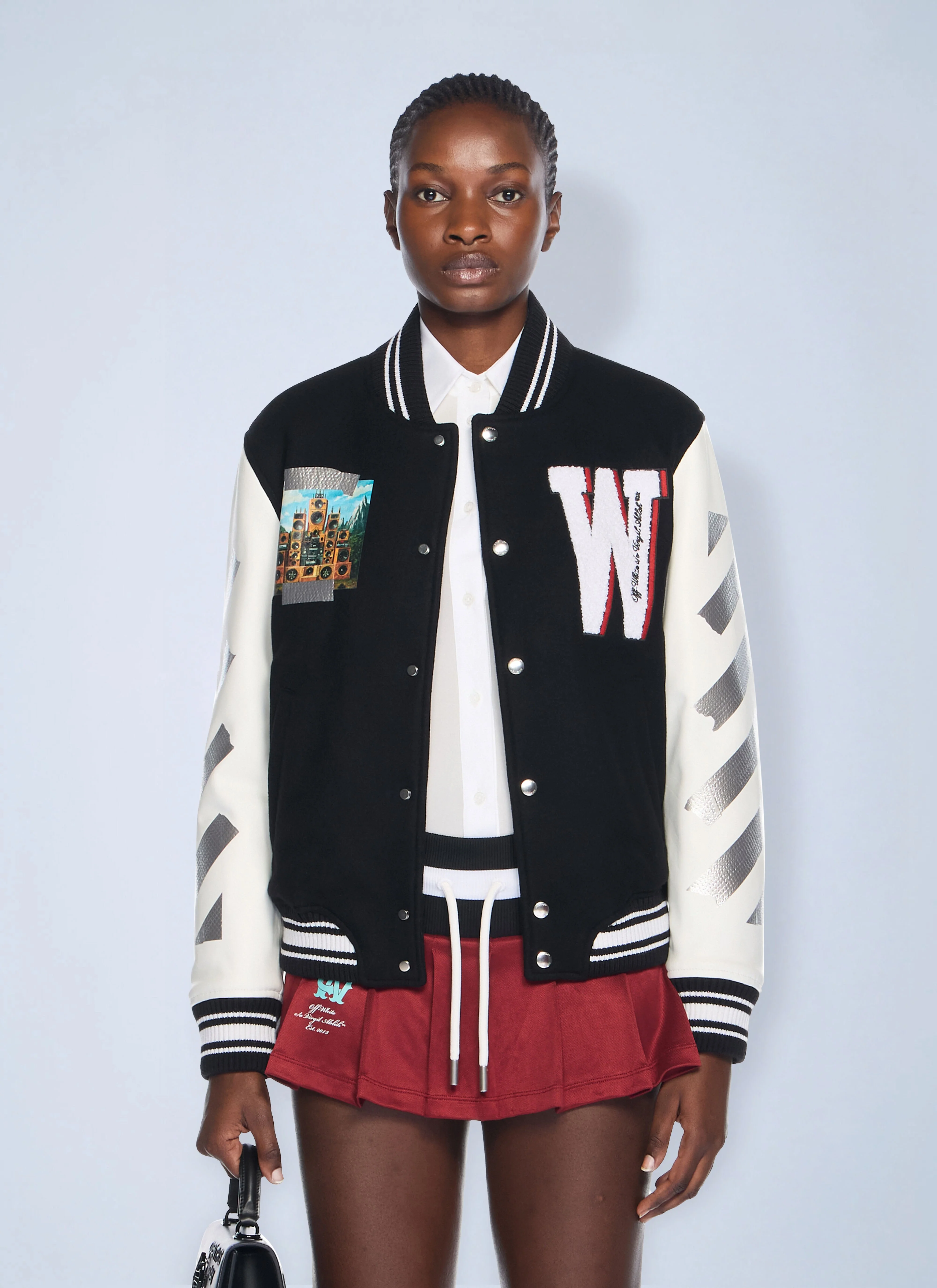 Wool-blend varsity jacket with embroidered graphics. - Wool-blend construction - Stand collar with snap fastening - Diagonal stripe sleeves - Front patch applique - Ribbed trims - Rear embroidered graphic - Lined interior - Back branding - 3% Polyester, 27% Polyamide, 70% Wool. Contrast: 100% Leather. Specialist dry clean - Color: Black - Code: OWEK006F25FAB0031026