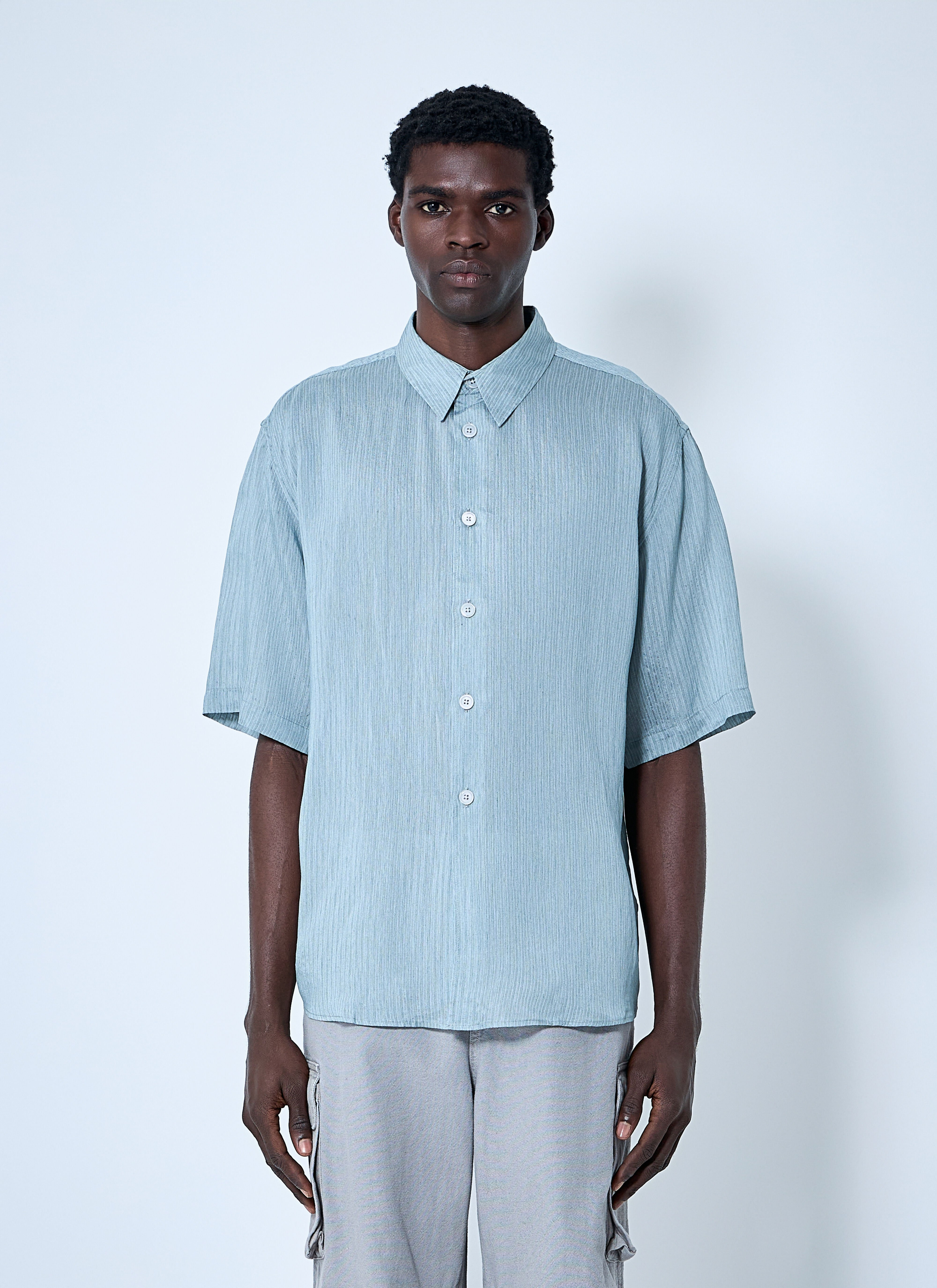 Shirt in geo stripe weave. - Classic collar - Front button fastening - Short sleeves - 84% Viscose, 16% Silk. Hand wash - Color: Blue - Code: M2252BG