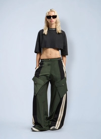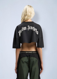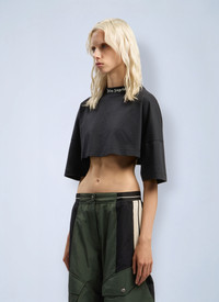 Cropped cotton jersey t-shirt with back logo. - Banded crewneck - Wide-cut short sleeves - Back curved logo print - Cropped - 100% Cotton. Trim: 100% Cotton. Dry clean - Color: Black - Code: PWAA054F25JER0011003