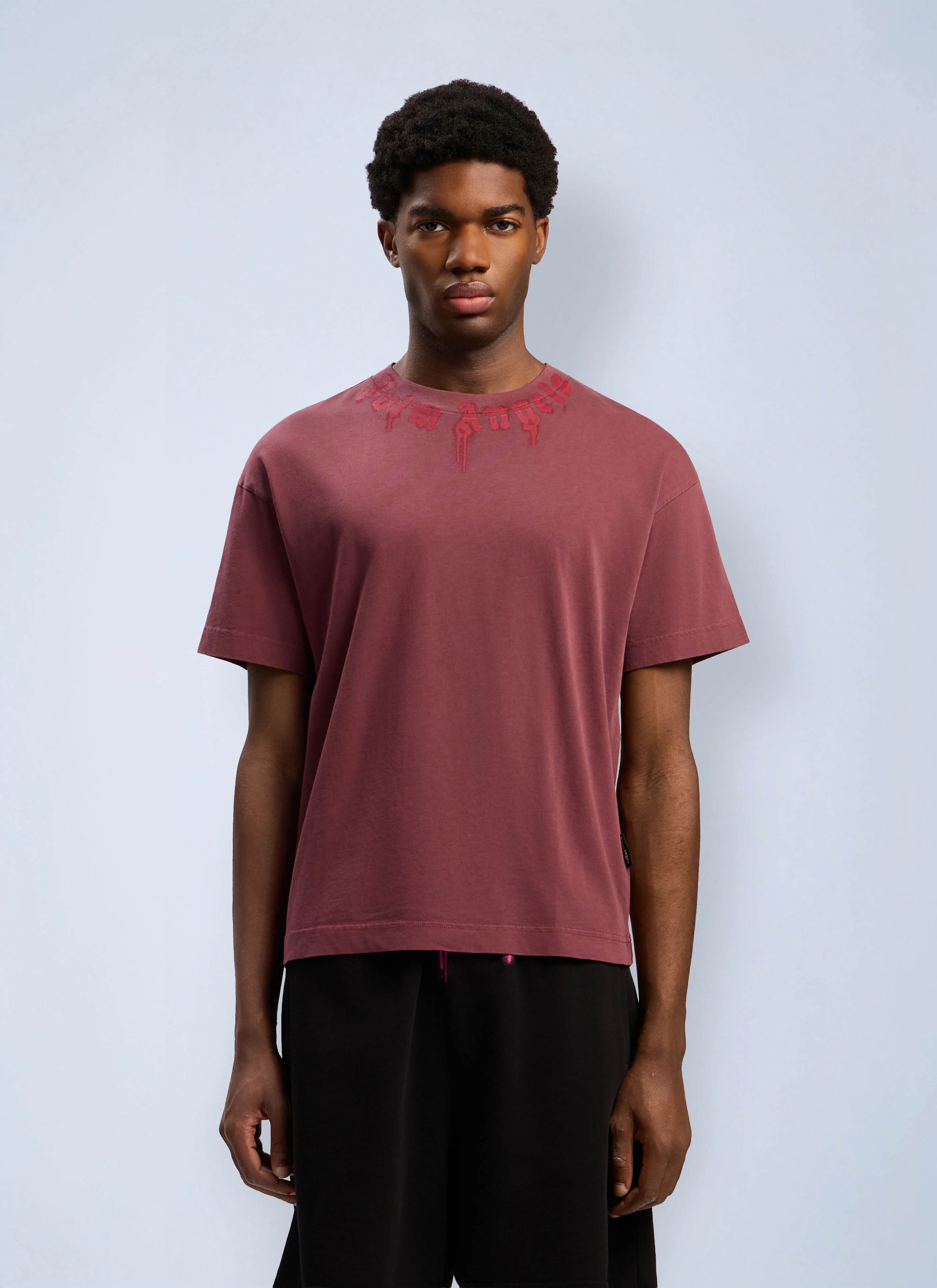 Boxy cotton jersey t-shirt with neck logo. - Boxy silhouette - Ribbed crewneck - Short sleeves - Neck logo detail - Relaxed hem - 100% Cotton. Contrast: 100% Cotton. Dry clean - Color: Bordeaux - Code: PMAA109F25JER0092825