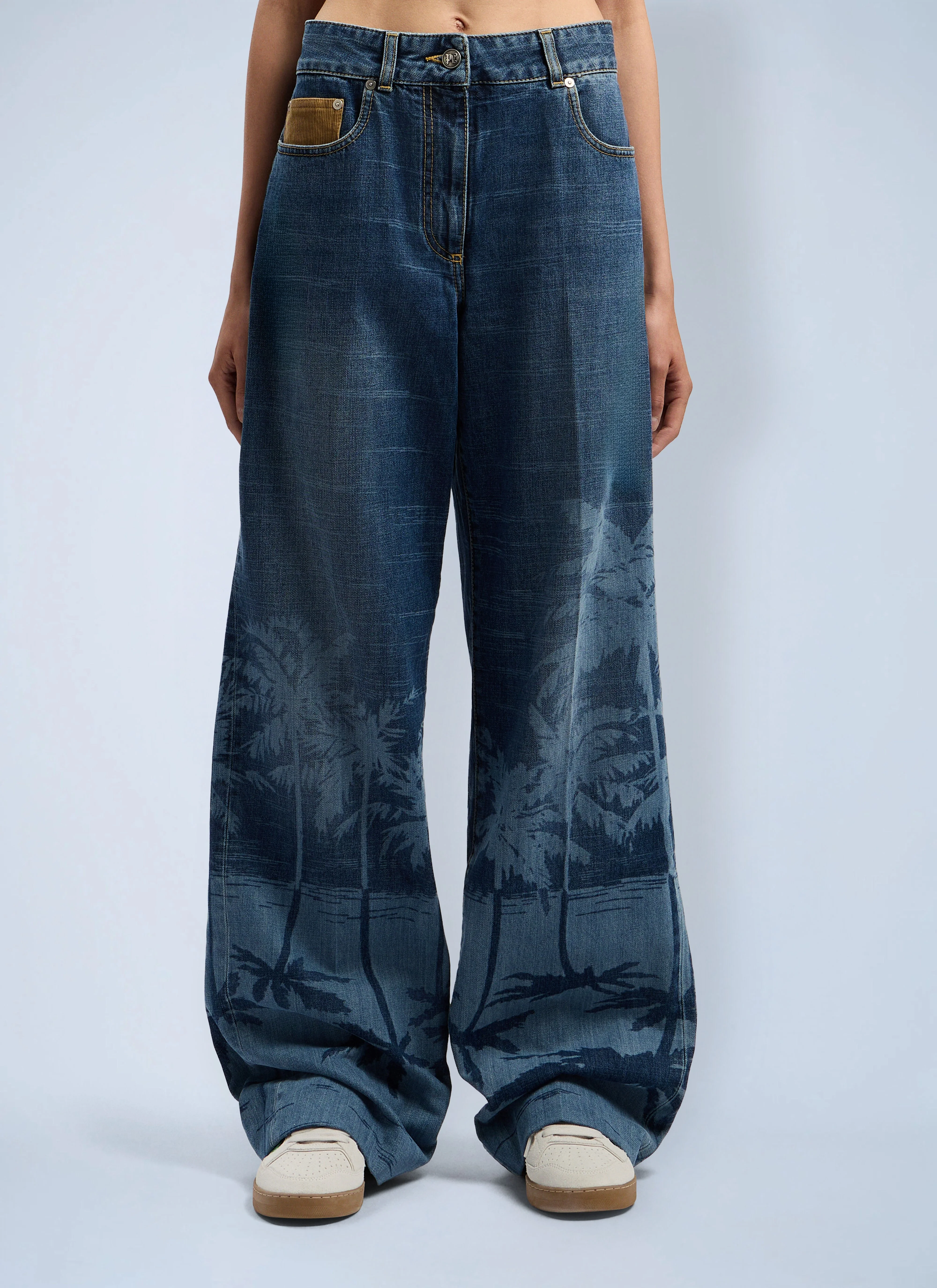 Wide-leg denim pants with palm tree motif. - Wide-leg silhouette - Button and zip fastening - Rear patch pockets - Palm tree motif - Belt loops - Contrast stitching - 100% Cotton. Lining: 65% Cotton, 35% Polyester. Dry clean - Color: Light Blue - Code: PWYA038F25DEN0014061