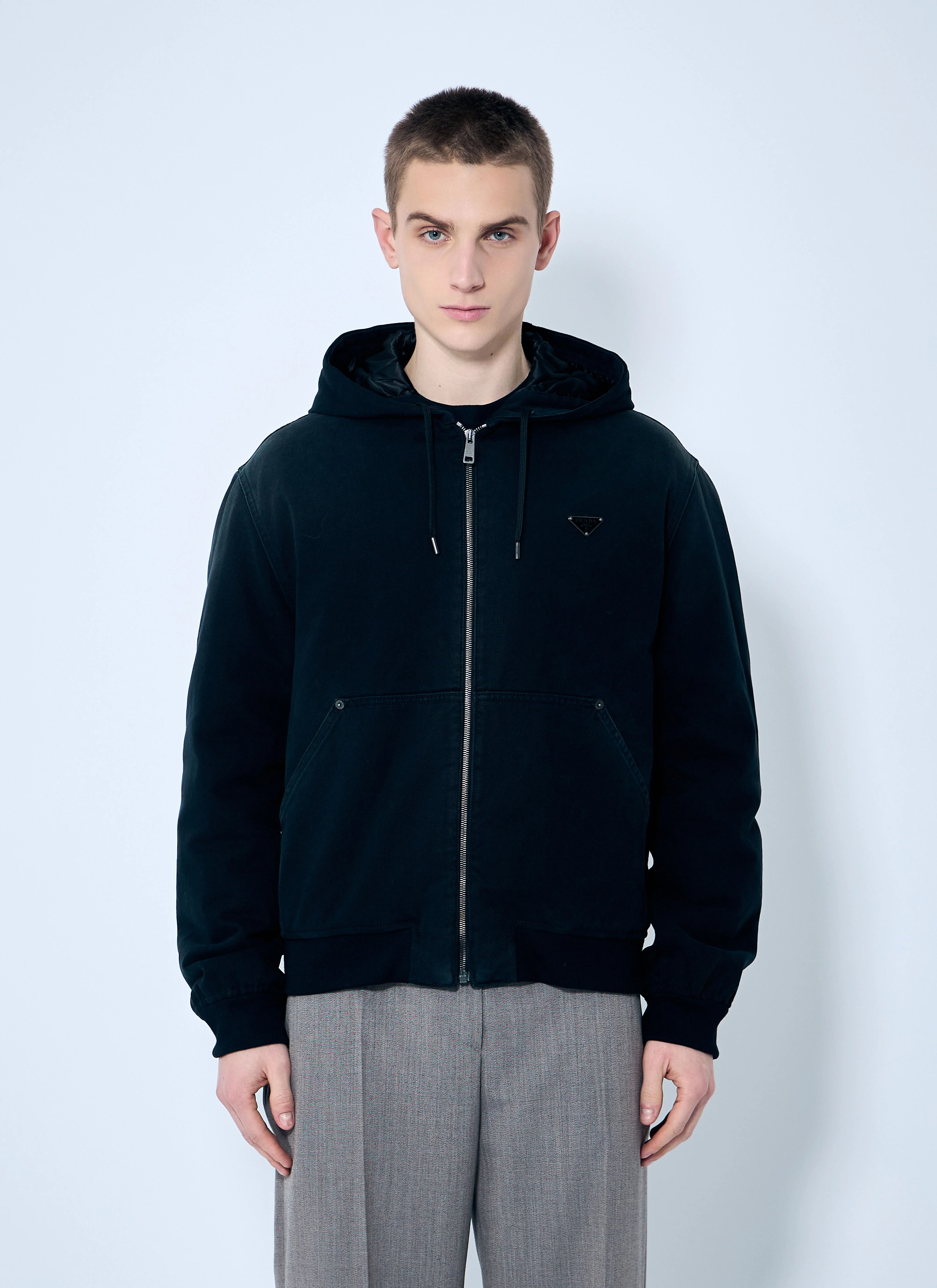 Denim jacket with a slightly padded finish. - Hood - Front zip fastening - Long sleeves - Front logo plaque - Front slip pockets - Made in Italy - 100% Cotton. Hand wash - Color: Black - Code: GEB274 148J F0557