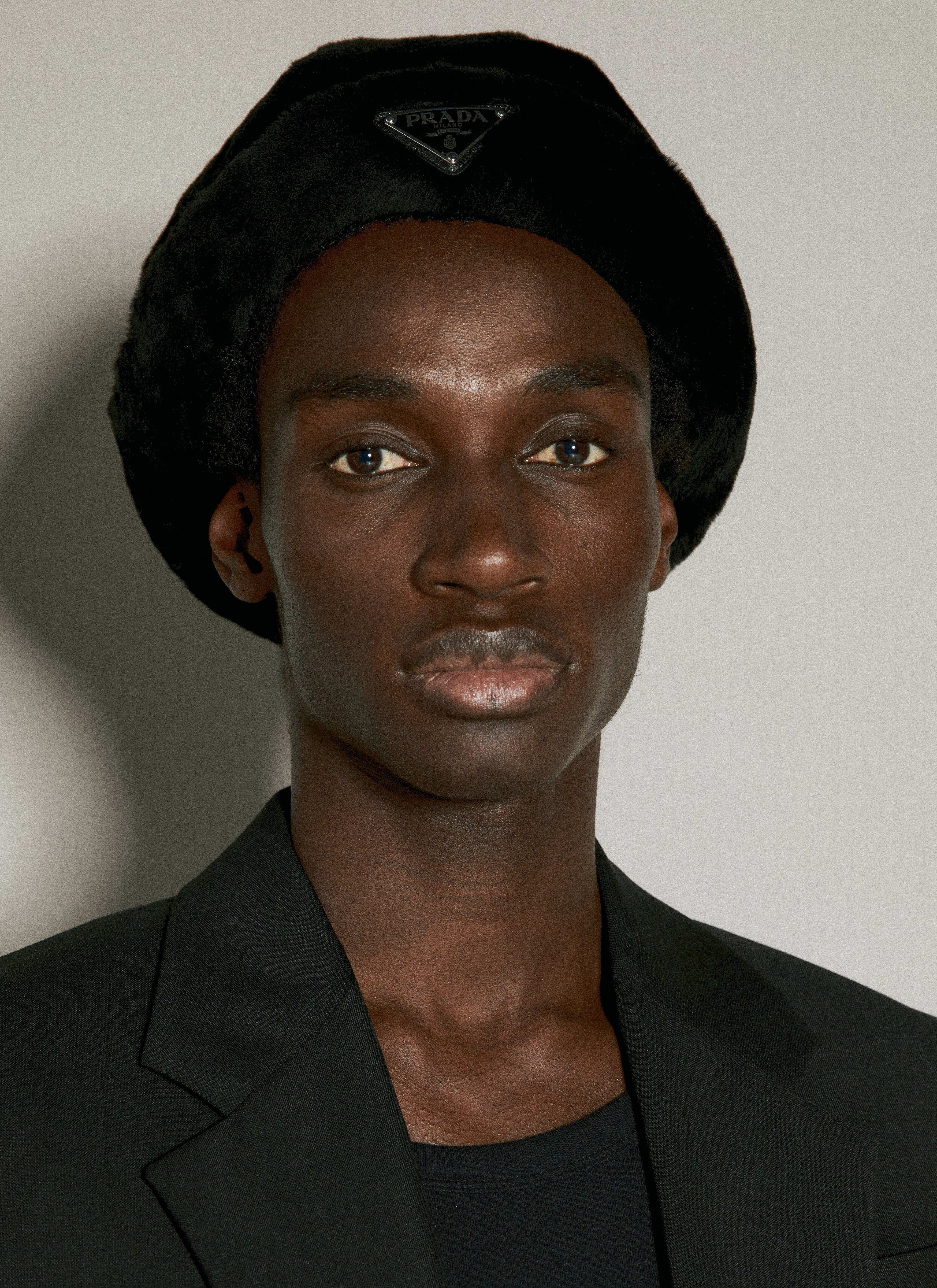 Shearling hat with front logo plaque. - Round crown - Folded brim - Logo plaque at brim - Quilted lining - Made in Italy - 100% Shearling - Color: Black - Code: 2HC168 2EC9 F0002