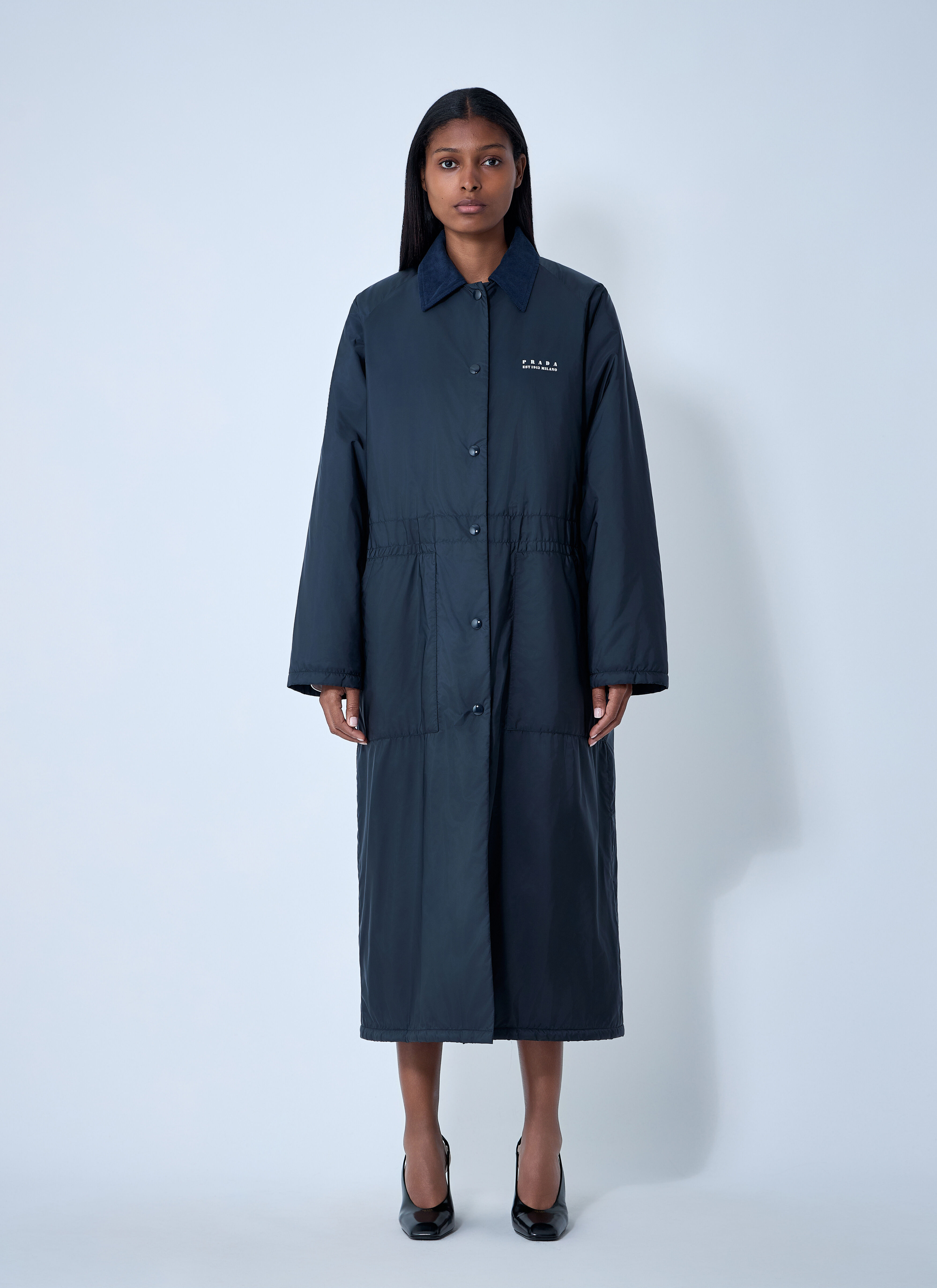 Logn coat with logo print at chest. - Classic collar - Front snap-button fastening - Long sleeves - Chest logo print - Elasticated waistband - Side slip pockets - 100% Polyamide. Dry clean - Color: Blue - Code: 29X287 1WQ9 F0008