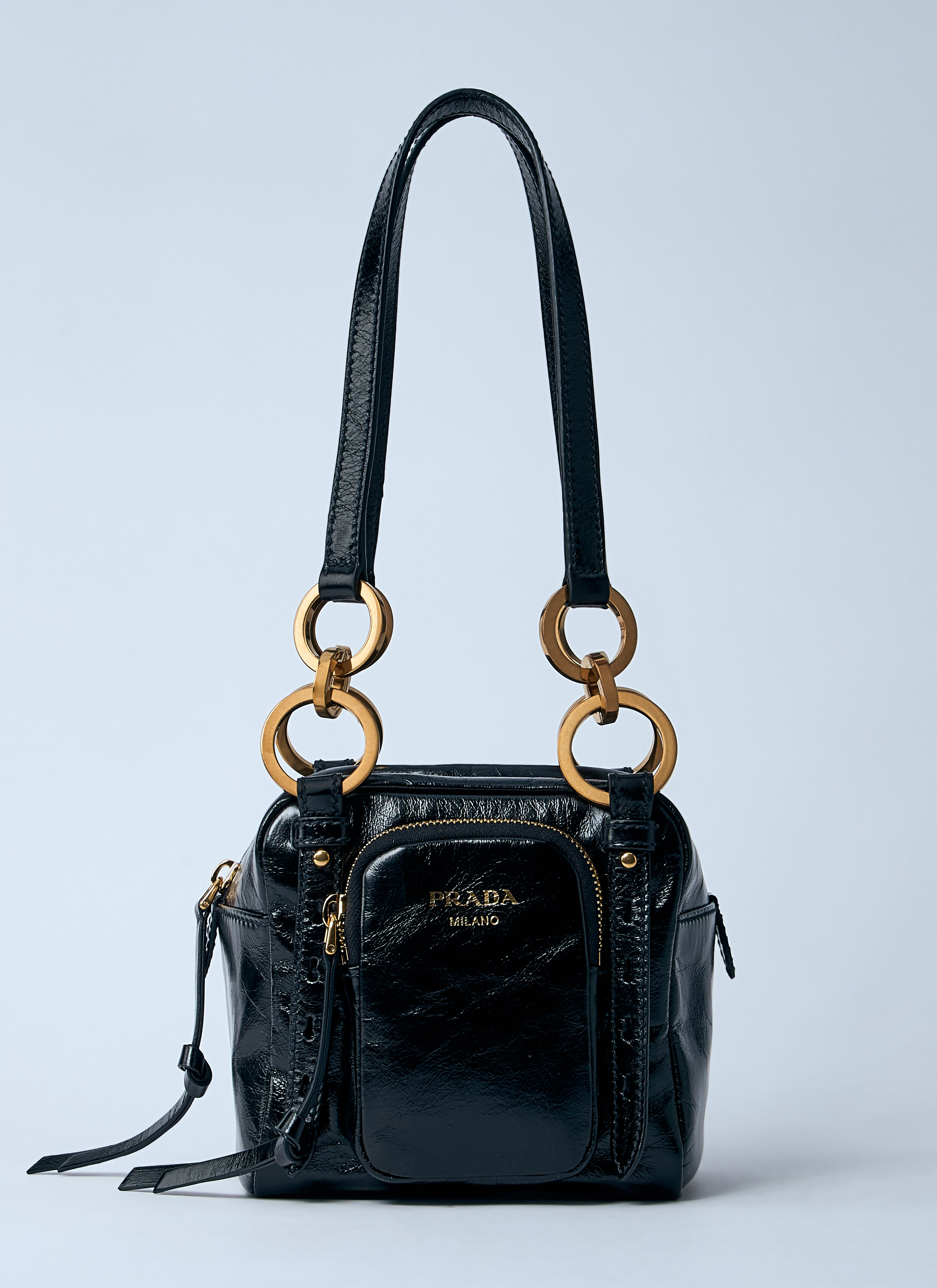Leather in high-shine crinkle finish. - Twin handles - Top zip fastening - Front logo hardware - Front zip fastening pocket - One main compartment - Gold-tone hardware - 100% Leather - Color: Black - Code: 1BB137 2CYR F0002