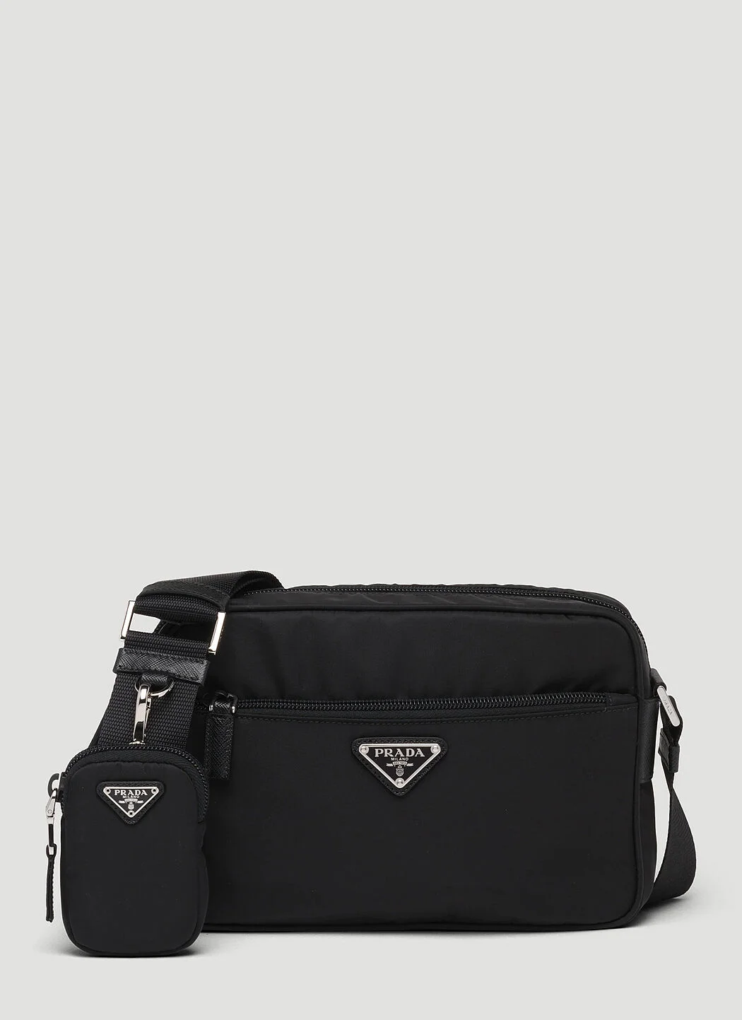 Re-Nylon shoulder bag with leather trims. - Detachable and adjustable strap - Top zip fastening - Front logo plaque - One main compartment - Detachable pouch - 100% Nylon. Trims: 100% Leather - Color: Black - Code: 1BC167 RV44 F0002