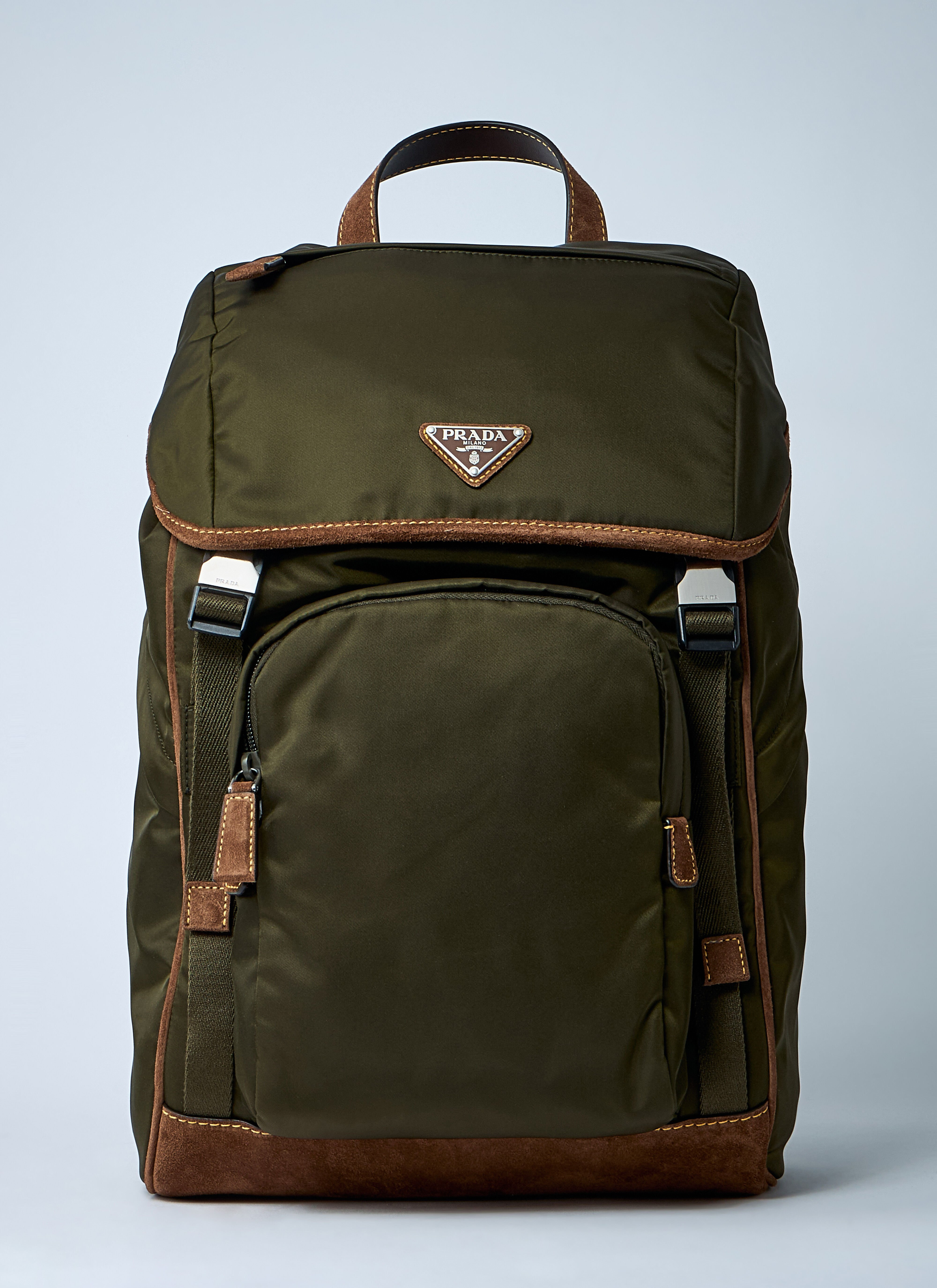 Re-Nylon backpack with logo plaque and suede trims. - Twin handles - Top handle - Flap-over construction with drawstring fastening - Front zip fastening pocket - Front logo plaque - One main compartment - 100% Nylon. Trims: 100% Leather - Color: Brown - Code: 2VZ135 384 F041O