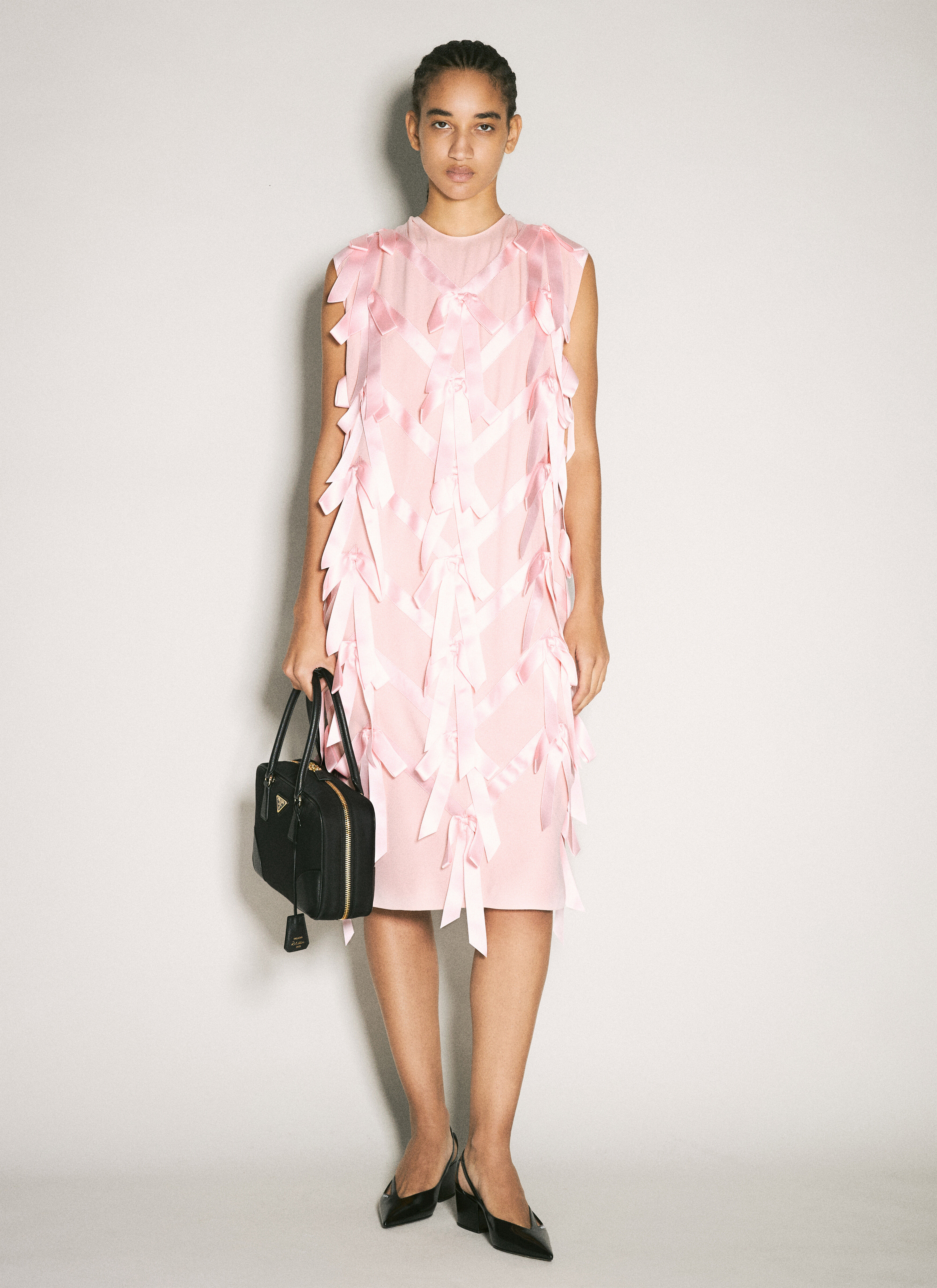 Sable midi dress with satin bows at front. - Round neck - Button fastening at nape - Front bow embellishment - Contrast rear - Rear centre split - Made in Italy - 45% Acetate, 26% Viscose. Dry clean - Color: Pink - Code: P3N88R 15ZQ F0482