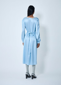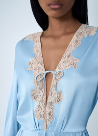 V-neck midi dress in satin finish with lace detail. - V-neckline - Long sleeves - Lace trim detail - 100% Silk. Dry clean - Color: Light Blue - Code: P3Q31 170Q F0AE7