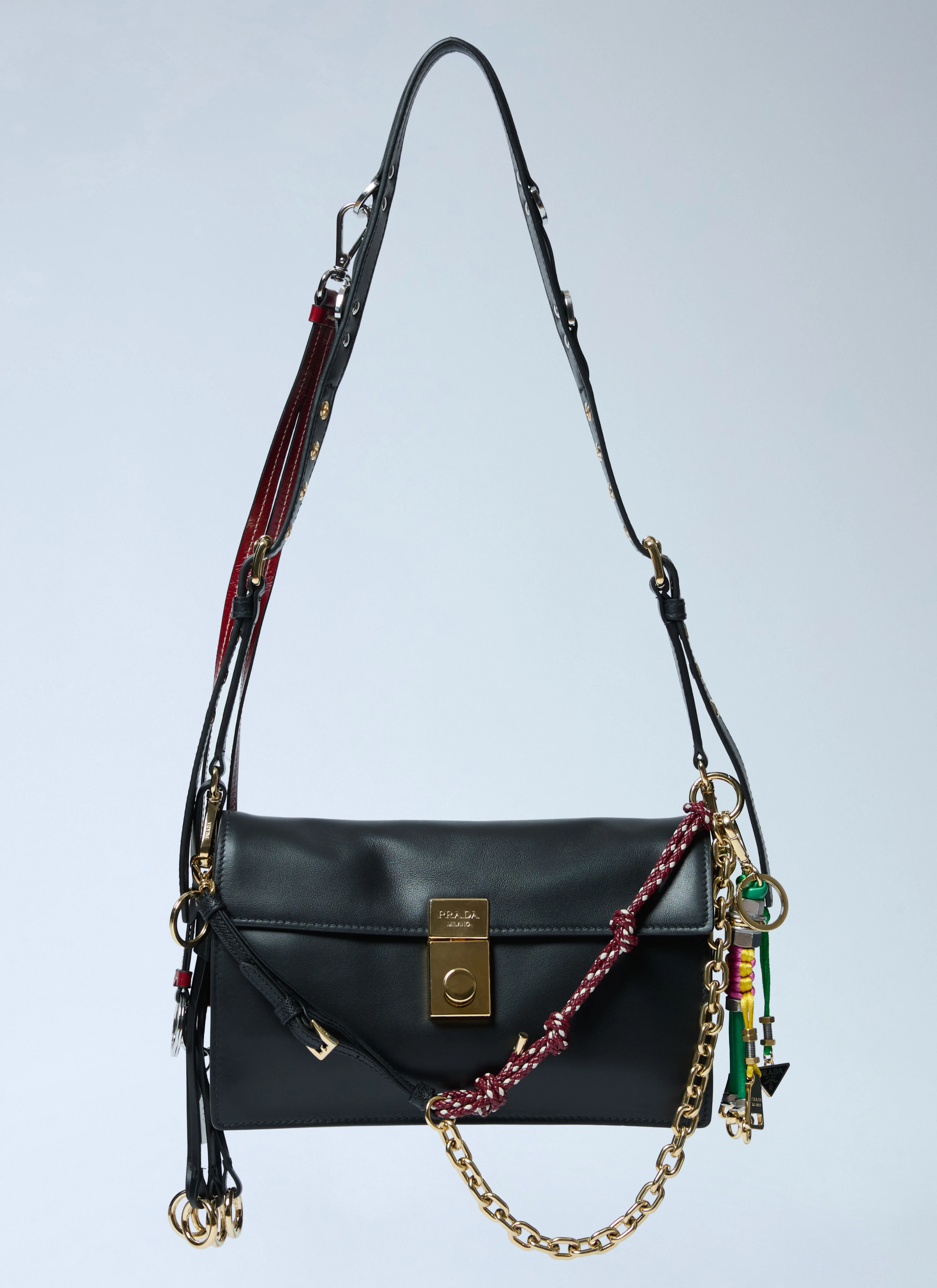 Leather in smooth-grain finish. - Detachable and adjustable strap - Multiple strap design - Flap-over closure fastening with logo engraved motif - One main compartment - Gold-tone hardware - 100% Leather - Color: Black - Code: 1BD379 2C6A F0002